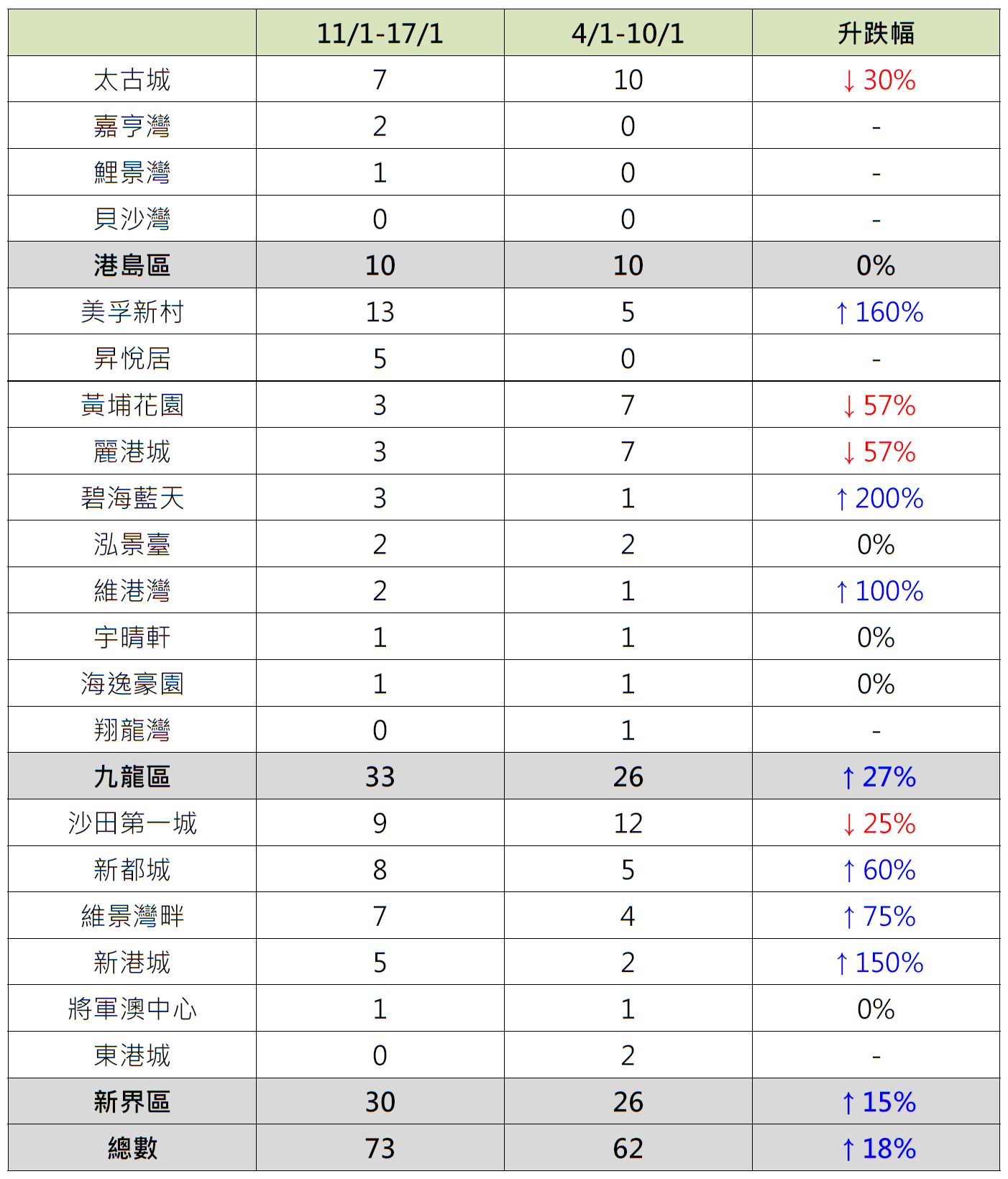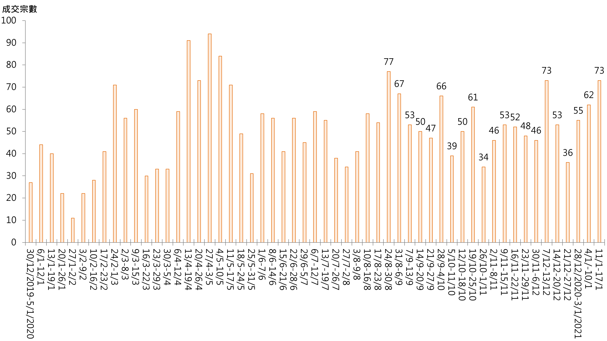 据本行前线分行所录得的数字显示,综合过去一星期(1月11日至1月17日)全港20大主要屋苑二手买卖录73宗成交,较前周(1月4日至1月10日)的62宗增加约18%,连升3周,创近5周新高(见图)。