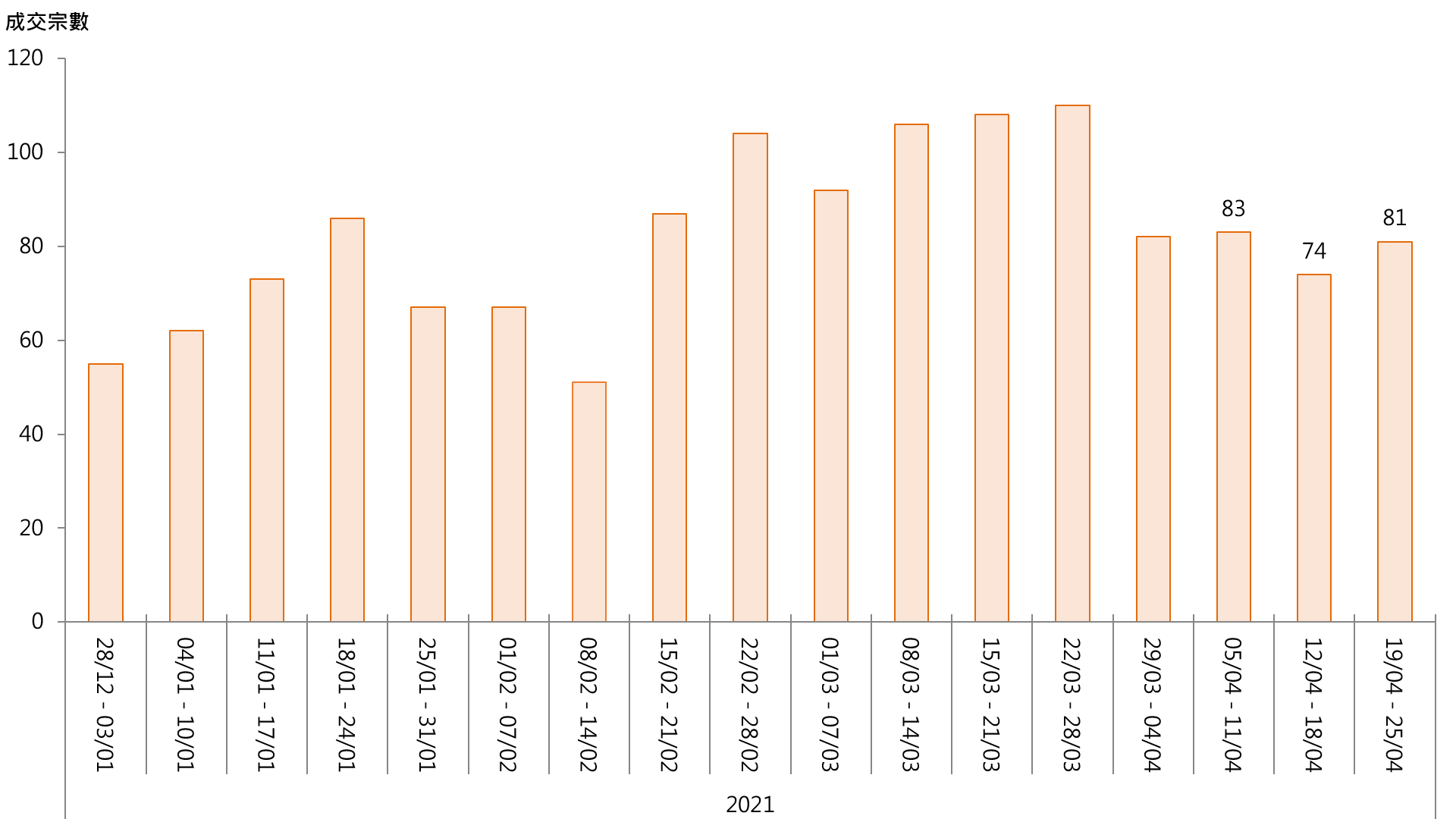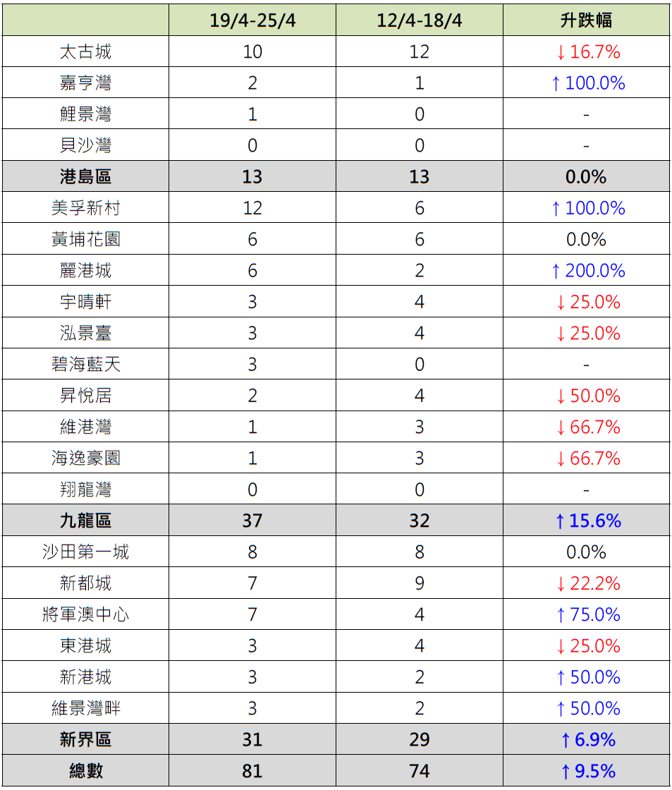 据本行前线分行所录得的数字显示,综合过去一星期(4月19日至4月25日)全港20大主要屋苑二手买卖录81宗成交,较前周(4月12日至4月18日)的74宗增加约9.5%(见图)。