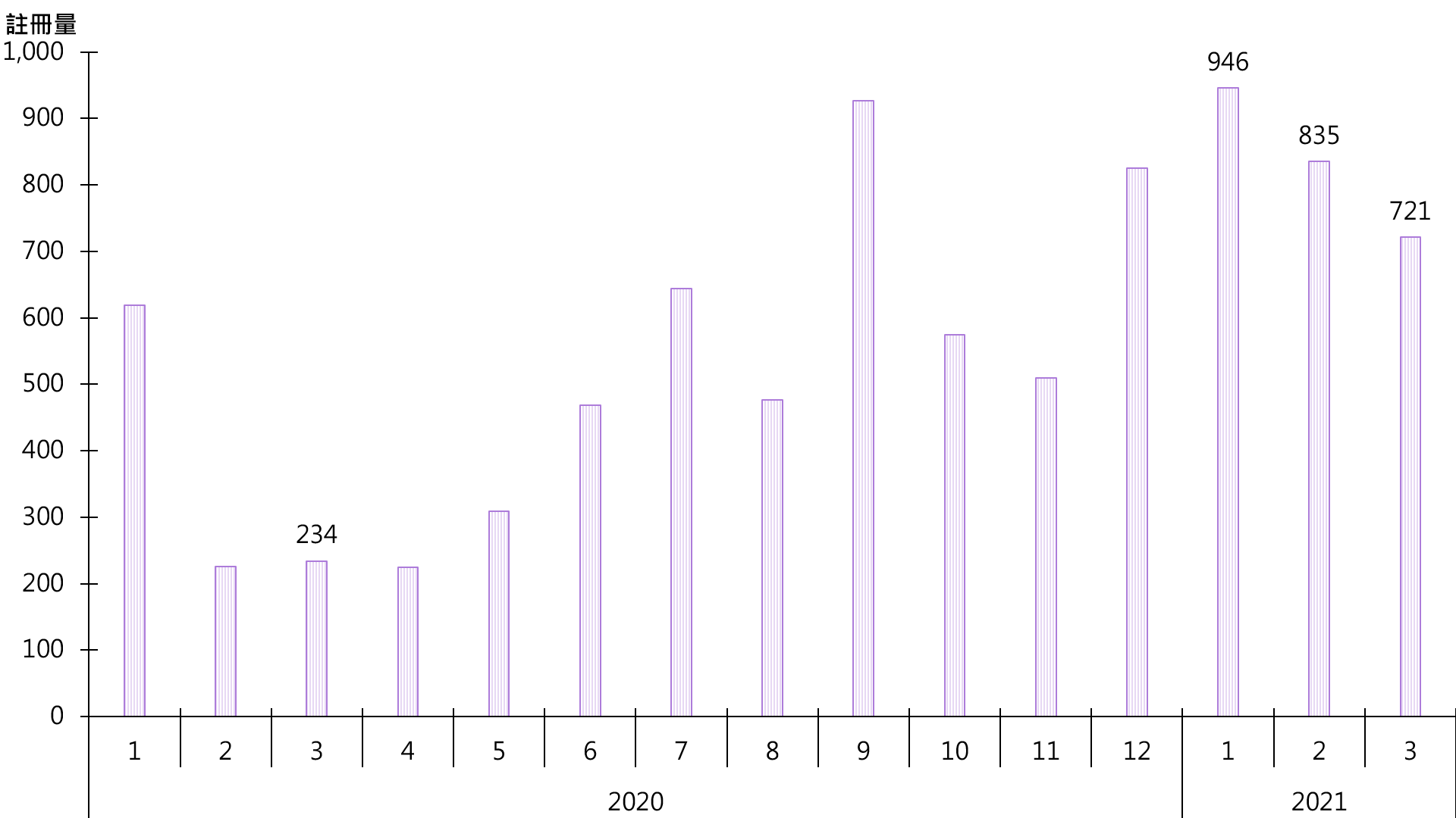 据土地注册处资料显示,3月录721宗纯车位注册,虽较2月的835宗减少约13.7%,但若与去年3月的234宗相比,则增加逾2倍(见图)。鉴于签署买卖合约至递交到土地注册处注册登记需时,3月注册个案一般主要反映2月市况。