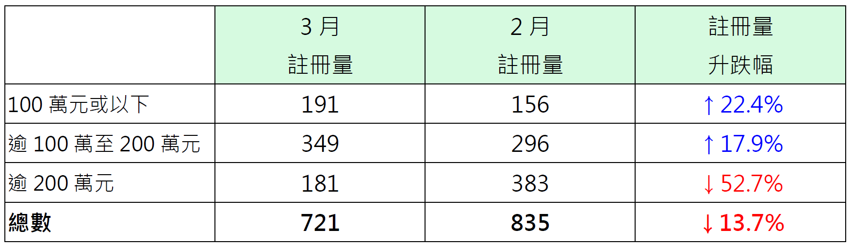 若按金额划分3月纯车位注册量表现,其中价值200万元以上纯车位录181宗注册,较2月的383宗减少约52.7%;相反,价值100万以上至200万元纯车位录349宗注册,较2月的296宗增加约17.9%;价值100万元或以下纯车位录191宗注册,较2月的156宗增加约22.4%(见表)。
