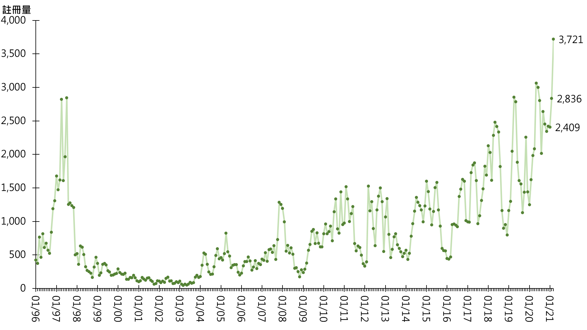 图:每月逾500万至1,000万元二手住宅注册量走势