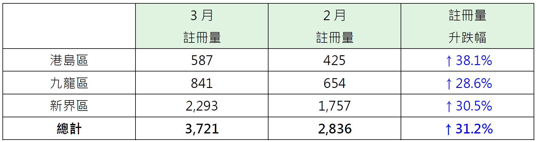 若以港岛、九龙及新界三区划分3月逾500万至1,000万元二手住宅注册量表现,其中港岛区录587宗注册,较2月的425宗增加约38.1%;九龙区录841宗注册,较2月的654宗增加约28.6%;新界区录2,293宗注册,较2月的1,757宗增加约30.5%(见表)。