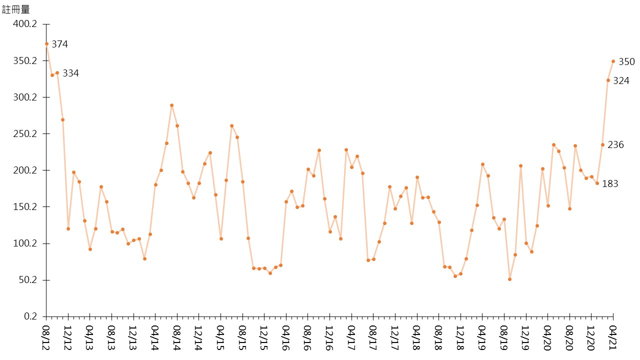 据土地注册处资料显示,本行选取的将军澳区20个私人屋苑4月录350宗二手住宅注册,较3月的324宗增加约8%,表现较整体二手住宅注册量按月升约6.1%为佳,亦创逾8年半新高(见图)。鉴于签署买卖合约至递交到土地注册处注册登记需时,4月注册个案一般主要反映3月市况。