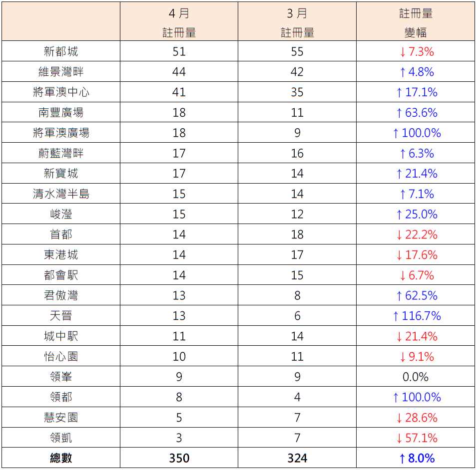 至于4月注册量屋苑排名方面,新都城虽然按月减少约7.3%,但仍以51宗注册居榜首;维景湾畔以44宗注册排第二,较3月的42宗增加约4.8%;将军澳中心以41宗注册排第三,较3月的35宗增加约17.1%(见表)。