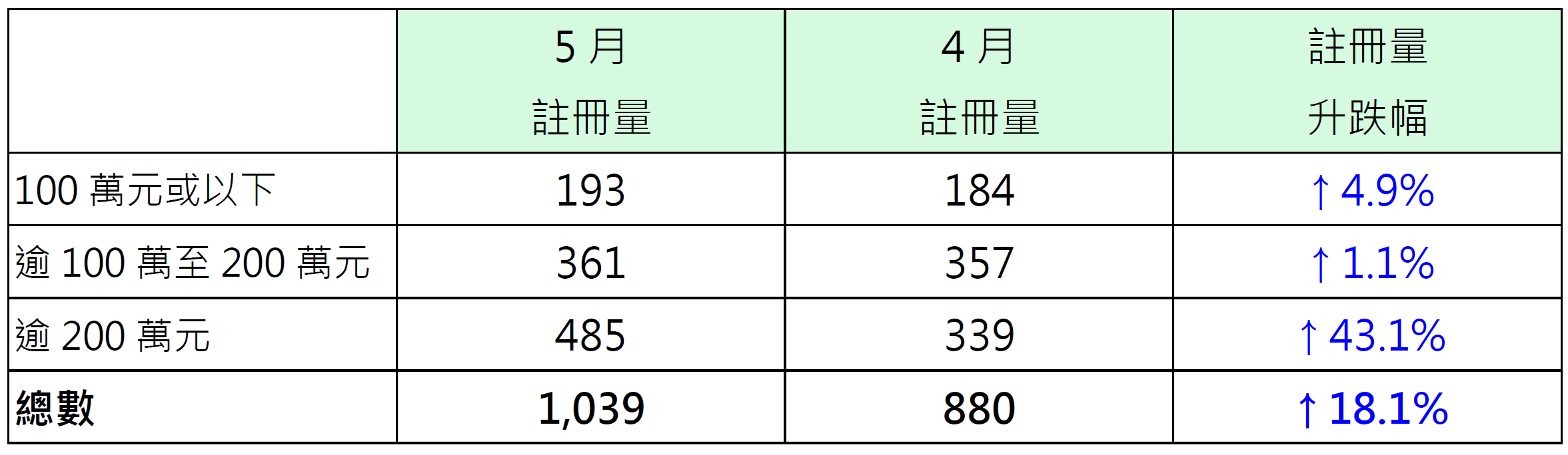 若按金额划分5月纯车位注册量表现,其中价值200万元以上纯车位录485宗注册,较4月的339宗增加约43.1%,带动整体纯车位注册量升上逾千宗水平;价值100万元或以下纯车位录193宗注册,较4月的184宗增加约4.9%;价值100万以上至200万元纯车位录361宗注册,较4月的357宗增加约1.1% (见表)。
