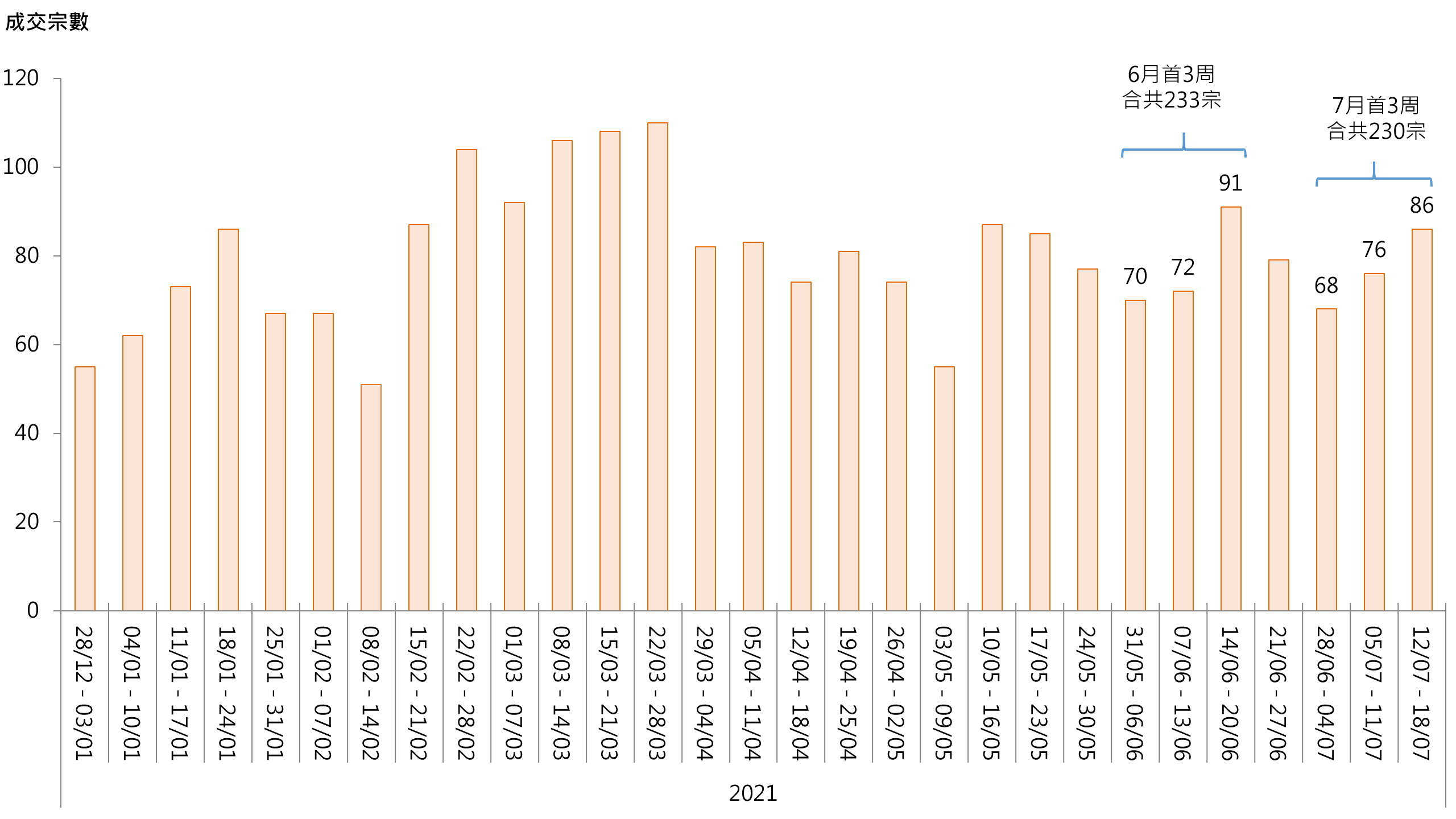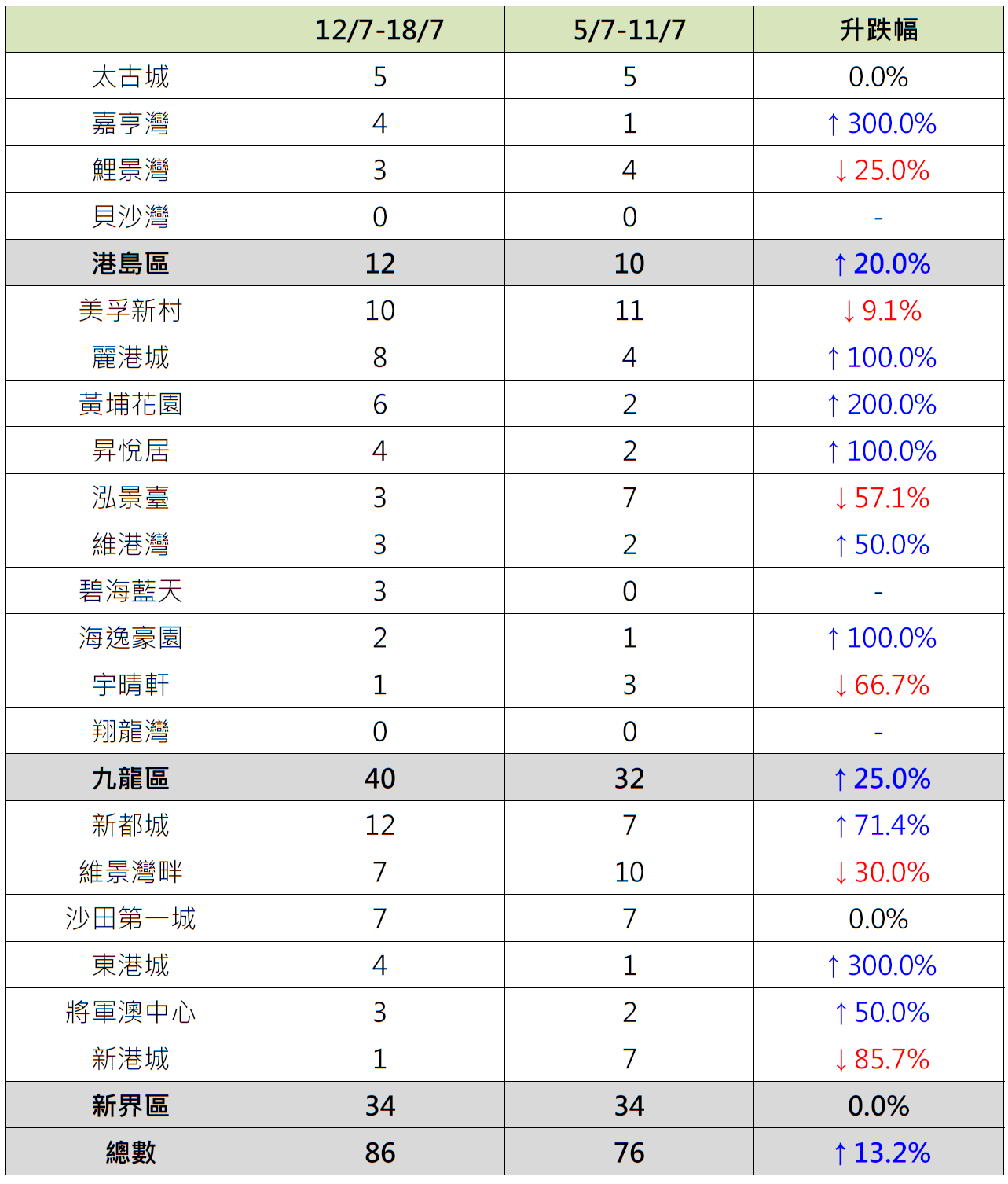 据本行前线分行所录得的数字显示,综合过去一星期(7月12日至7月18日)全港20大主要屋苑二手买卖录86宗成交,较前周(7月5日至7月11日)的76宗增加约13.2%;不过,7月首3周20大屋苑录230宗成交,按月微跌约1.3%(见图)。