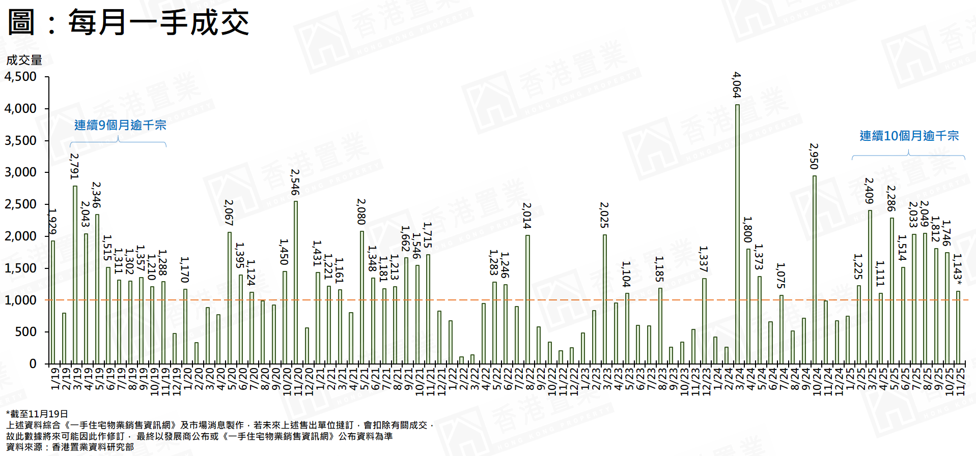 据香港置业资料研究部综合《一手住宅物业销售资讯网》资料及市场消息显示,11月(截至19日)已录约1,143宗一手成交,即自2月起连续10个月每月均录逾千宗成交,打破2019年3月至11月连续9个月录逾千宗成交的纪录,创自2013年一手销售条例后最长纪录(见图),足见今年一手成交势头畅旺。