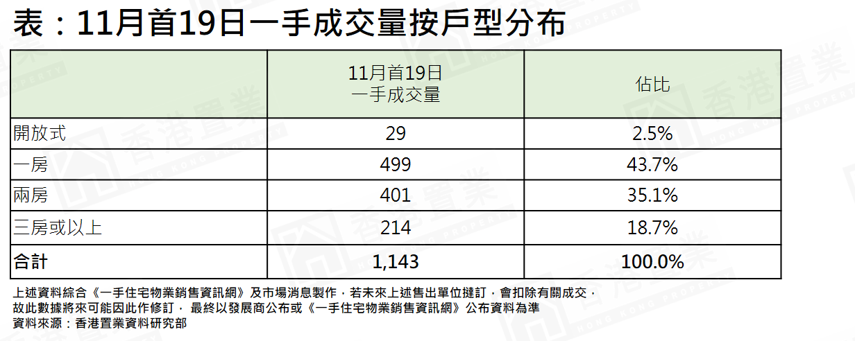 若将月内一手成交量以户型划分,一房单位成交录499宗(占约43.7%),暂各户型之中最多;其次是录401宗的两房单位(占约35.1%);至于三房或以上则占约18.7%(见表)。