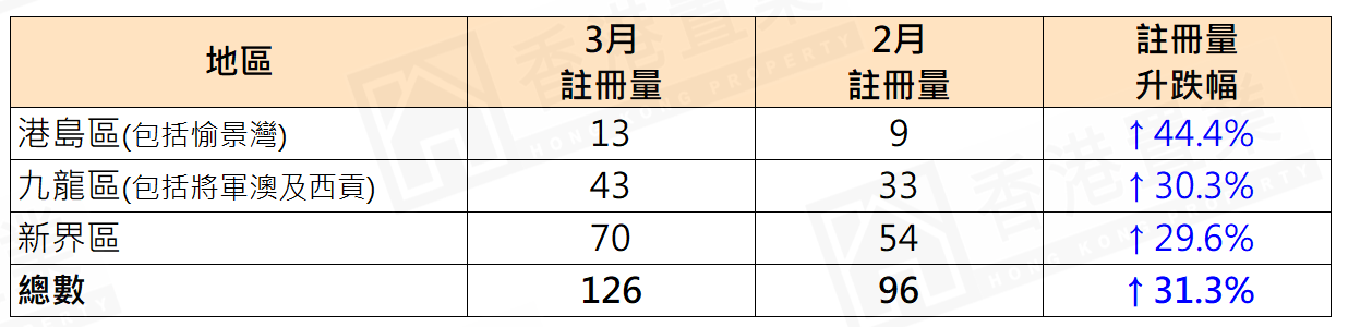 若以三区划分3月二手公屋注册量按月表现,当中新界区二手公屋录70宗注册,较2月的54宗增加约29.6%;九龙区(包括将军澳及西贡)二手公屋录43宗注册,较2月的33宗增加约30.3%;港岛区(包括愉景湾)二手公屋录13宗注册,较2月的9宗增加约44.4%(表)。