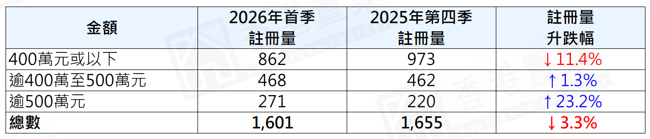 若以金额划分首季二手居屋注册量按季表现,当中400万元或以下二手居屋录862宗注册,较去年第四季的973宗减少约11.4%;相反,逾400万至500万元二手居屋录468宗注册,较去年第四季的462宗轻微增加约1.3%;逾500万元二手居屋录271宗注册,更较去年第四季的220宗增加约23.2%(表)。