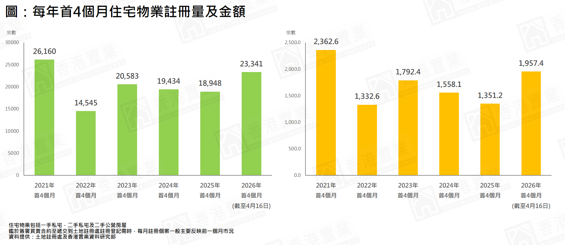 据香港置业资料研究部综合土地注册处资料显示,本年首4个月(截至4月16日)住宅物业(包括一手私宅,二手私宅及二手公营房屋)共录23,341宗注册,涉及金额达1,957亿元,比起去年首4个月录18,948宗及约1,351亿元分别高出约23.2%及约44.9%,两者已同创2021年旺市后的5年同期新高(见图)。金额按年升幅表现突出,住宅市场吸金力强劲,料今年首4个月势突破2,000亿元。