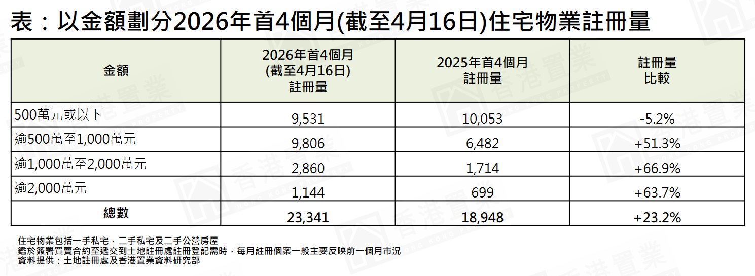 若以金额划分本年首4个月(截至4月16日)住宅物业(包括一手私宅,二手私宅及二手公营房屋)注册量按年表现,当中逾1,000万至2,000万元住宅物业按年升幅最大,年内录2,860宗注册,已较去年首4个月的1,714宗大幅高出约66.9%;逾2,000万元亦按年大升约63.7%,年内暂录1,144宗;在逾千万元个案急升下,带动住宅市场注册金额出现明显升幅(见表)。