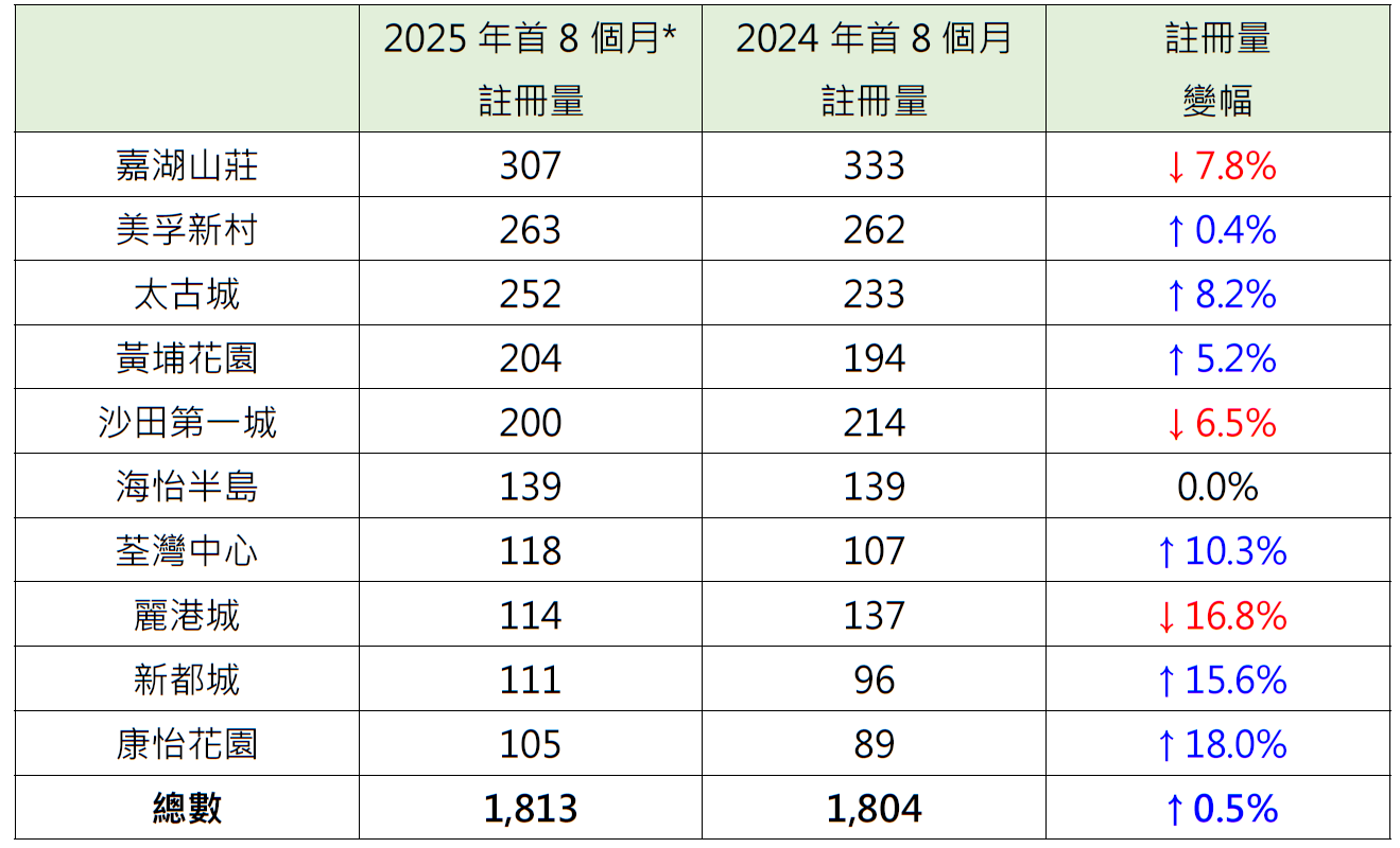 至于今年首8个月(截至8月28日)十大传统屋苑二手住宅注册量排名方面,嘉湖山庄宗数虽然按年同期下跌,但仍以307宗注册位居十大屋苑之首;美孚新村以263宗注册排第二,较去年首8个月的262宗微增约0.4%;太古城以252宗二手住宅注册紧随其后,较去年首8个月的233宗增加约8.2%(见表)。
