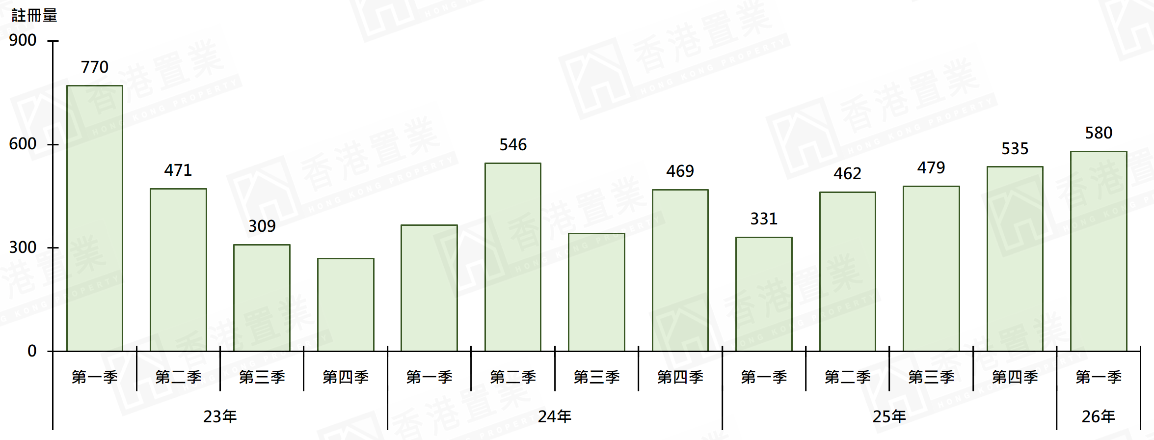 据香港置业资料研究部综合土地注册处资料显示,首季本行选取的将军澳区30个私人屋苑录580宗二手住宅注册,较去年第四季的535宗增加约8.4%,连升4季,创12季(即3年)新高(图)。