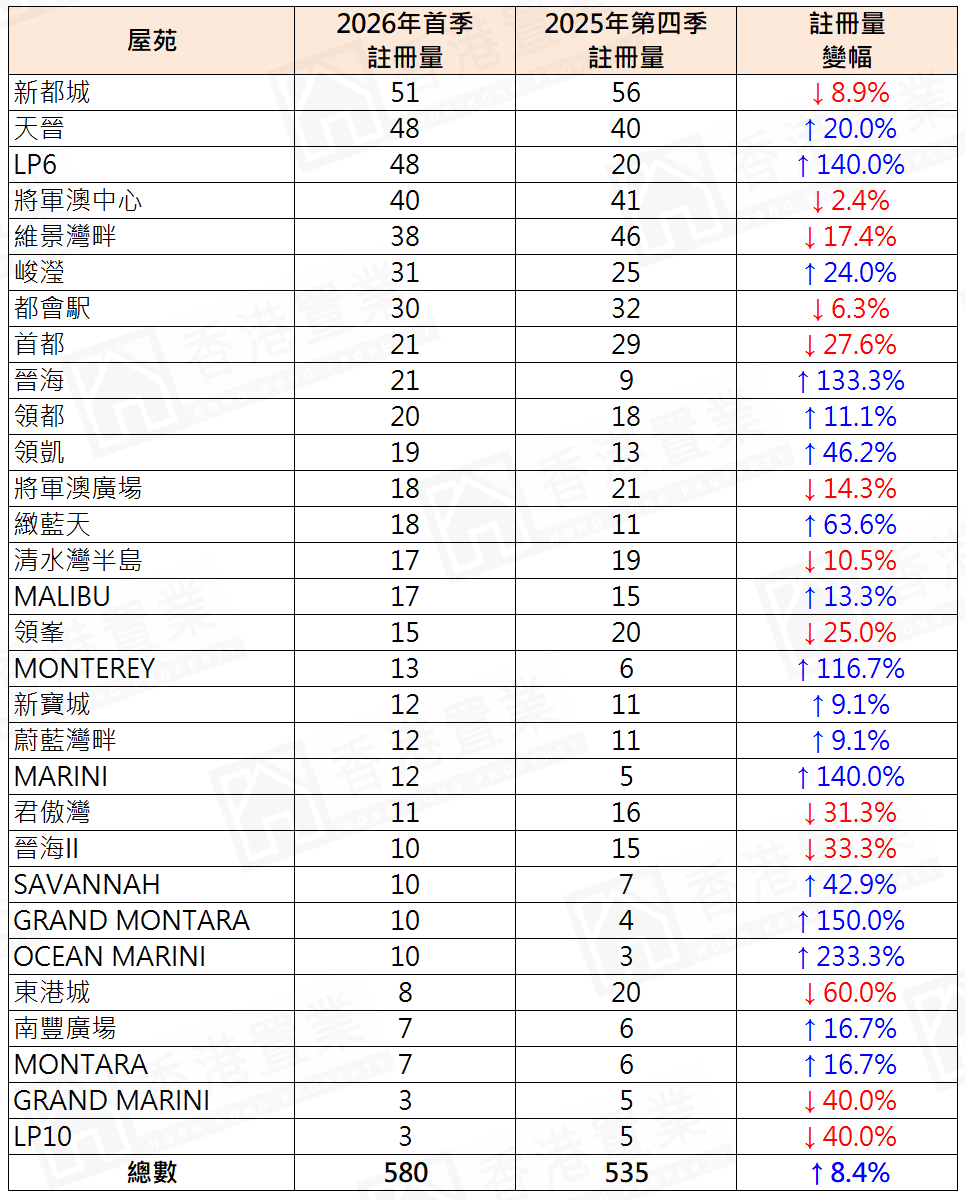 至于首季将军澳区30个私人屋苑二手住宅注册量排名方面,新都城以51宗注册居榜首,较去年第四季的56宗减少约8.9%;LP6与天晋齐以48宗二手住宅注册紧随其后,按季分别升1.4倍及2成(表)。