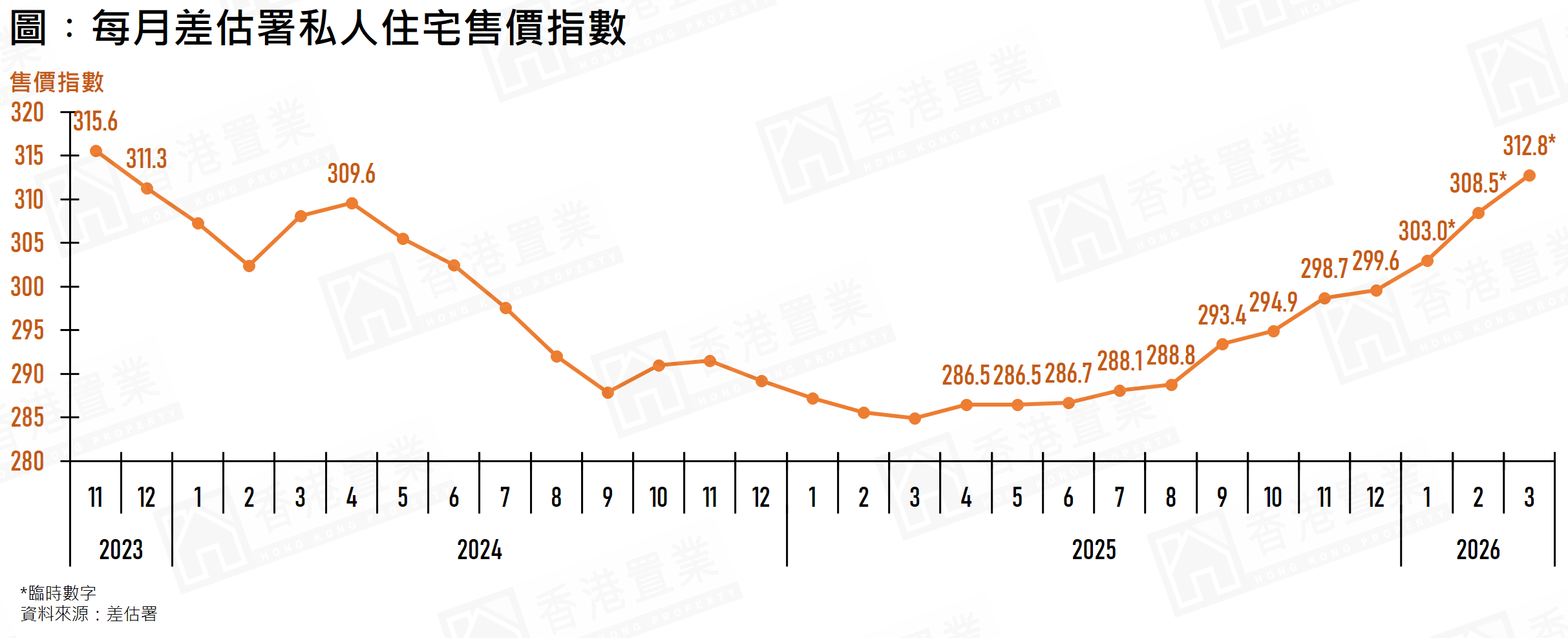今年私宅物业市场开局表现不俗,成交畅旺,楼价持续攀升;今日差估署公布私人住宅售价指数,最新3月报312.8点,按月升约1.4%,连升10个月,创28个月(即逾2年)新高;年内楼价升幅扩大至约4.4%(图)。