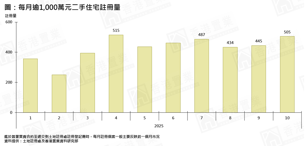 据土地注册处资料显示,10月二手住宅(包括二手私人住宅及二手公营房屋)录3,905宗注册,较9月的3,831宗微增约1.9%;当中逾1,000万元二手住宅录505宗注册,较9月的445宗更录约13.5%升幅,表现跑赢大市,除宗数创半年新高外,亦是今年的第二高位(见图)。鉴于签署买卖合约至递交到土地注册处注册登记需时,10月注册个案一般主要反映9月市况。