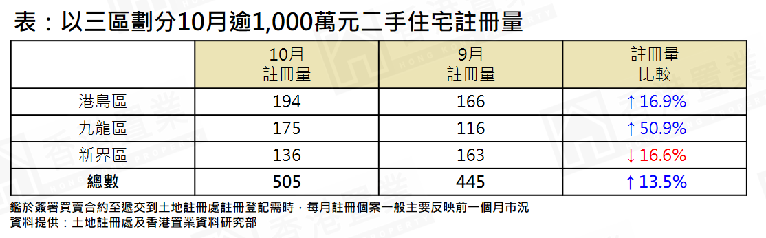 若以三区划分10月逾1,000万元二手住宅注册量按月表现,当中港岛区宗数最多,录194宗注册,较9月的166宗增加约16.9%;九龙区宗数按月升幅为三区最大,录175宗注册,较9月的116宗大幅增加约50.9%;相反,新界区逾1,000万元二手住宅录136宗注册,较9月的163宗则减少约16.6%,表现相当逊色(见表)。