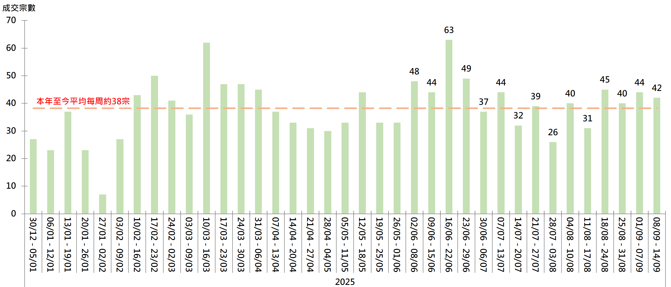 随着《施政报告》本周公布,加上市场预期今周美联储局将重启减息周期,买家入市信心增。据本行前线分行所录得的数字显示,综合过去一星期(9月8日至9月14日)全港20大主要屋苑二手买卖录42宗成交,较前周(9月1日至9月7日)的44宗轻微减少2宗,或约4.5%。计及上周,20大屋苑已连续4周企稳40宗水平,亦高于本年至今平均每周约38宗,反映近数周二手交投表现不俗(见图)。