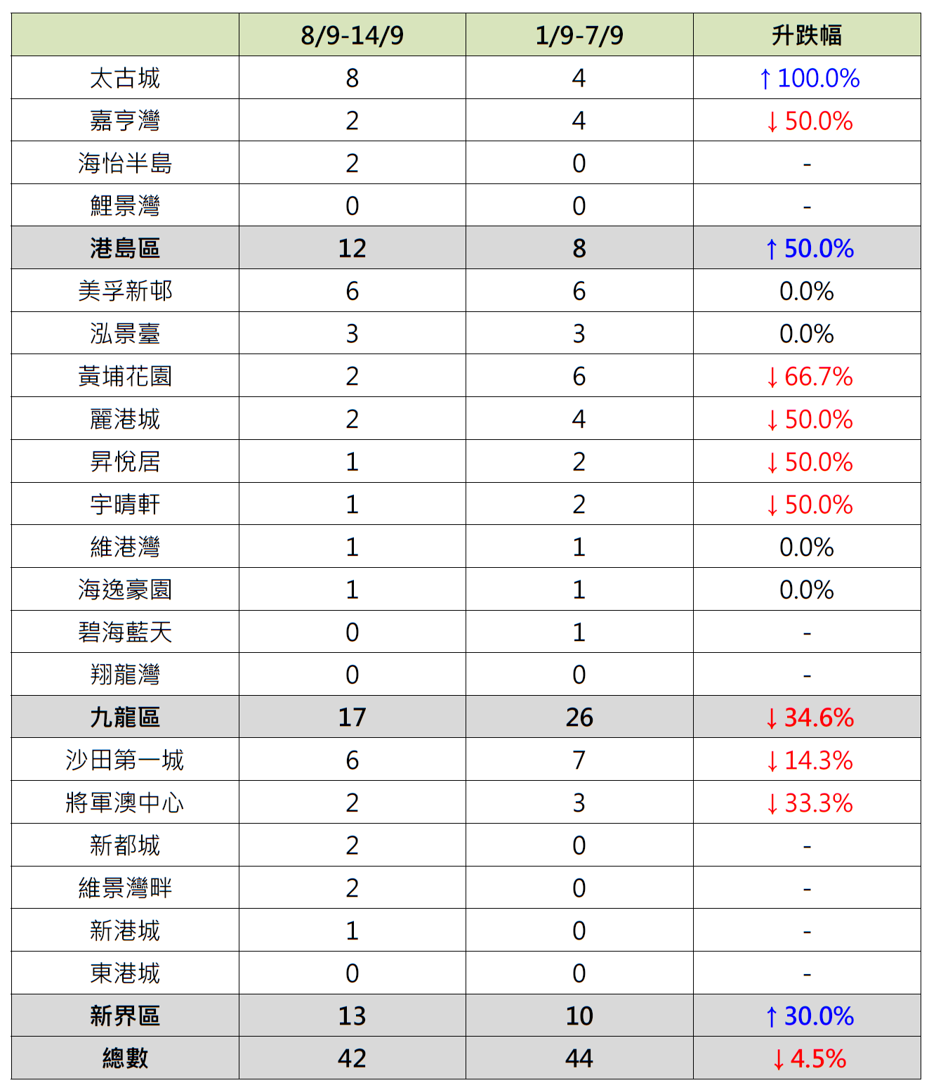 反观,港岛区及新界区屋苑按周录升,当中港岛区4个指标屋苑上周录12宗成交,较前周的8宗增加50%;其中太古城录8宗成交,较前周的4宗增加1倍;海怡半岛“破蛋”,按周增加2宗成交;相反,嘉亨湾录2宗成交,较前周的4宗减少50%。