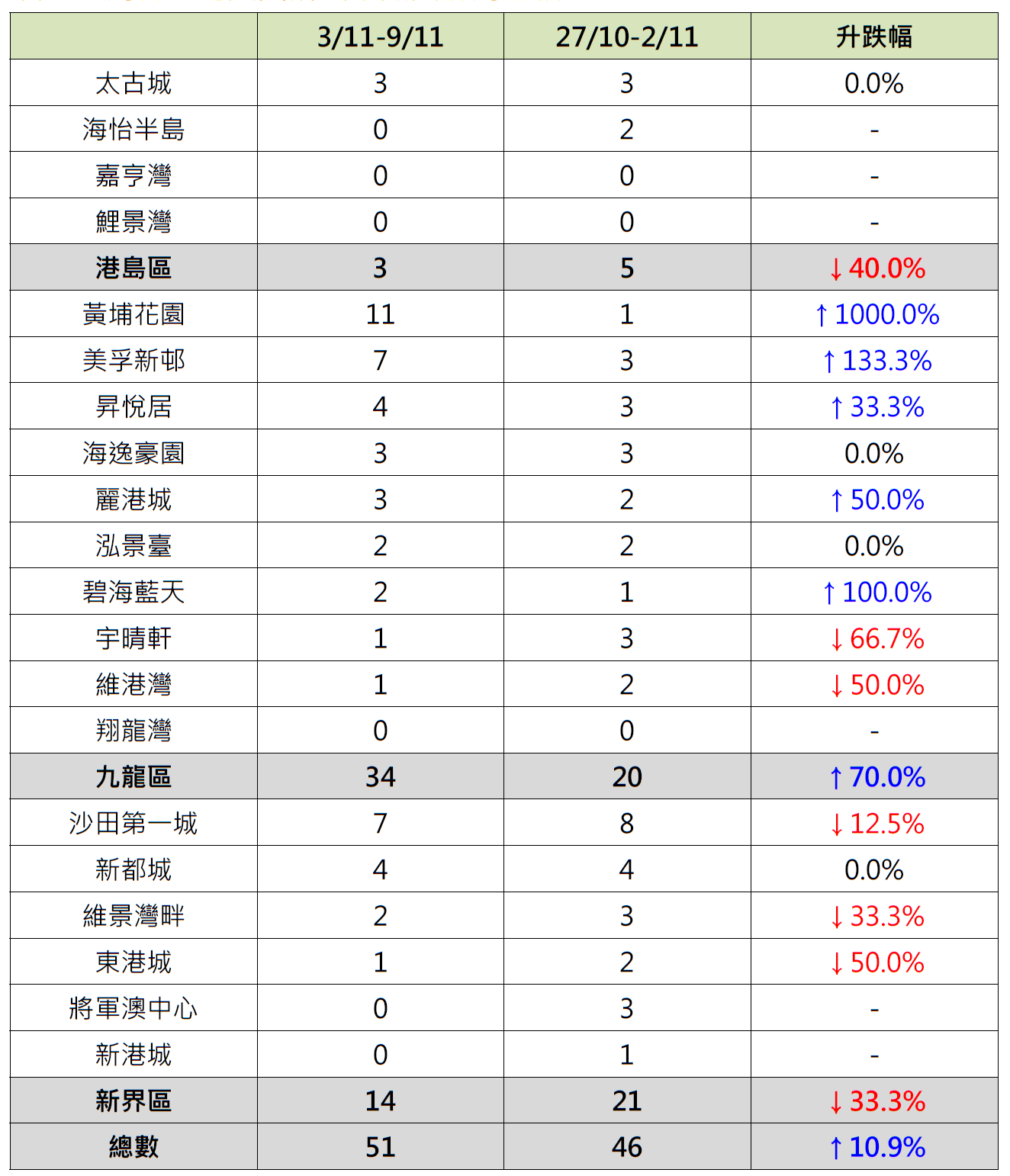反观,新界区及港岛区成交按周录跌,其中新界区6个指标屋苑上周录14宗成交,较前周的21宗减少约33.3%;当中沙田第一城录7宗成交,较前周的8宗减少12.5%;维景湾畔录2宗成交,较前周的3宗减少约33.3%;东港城录1宗成交,较前周的2宗减少50%;新港城由前周录1宗成交减少至上周“零成交”;将军澳中心更由前周录3宗成交减少至上周“零成交”。