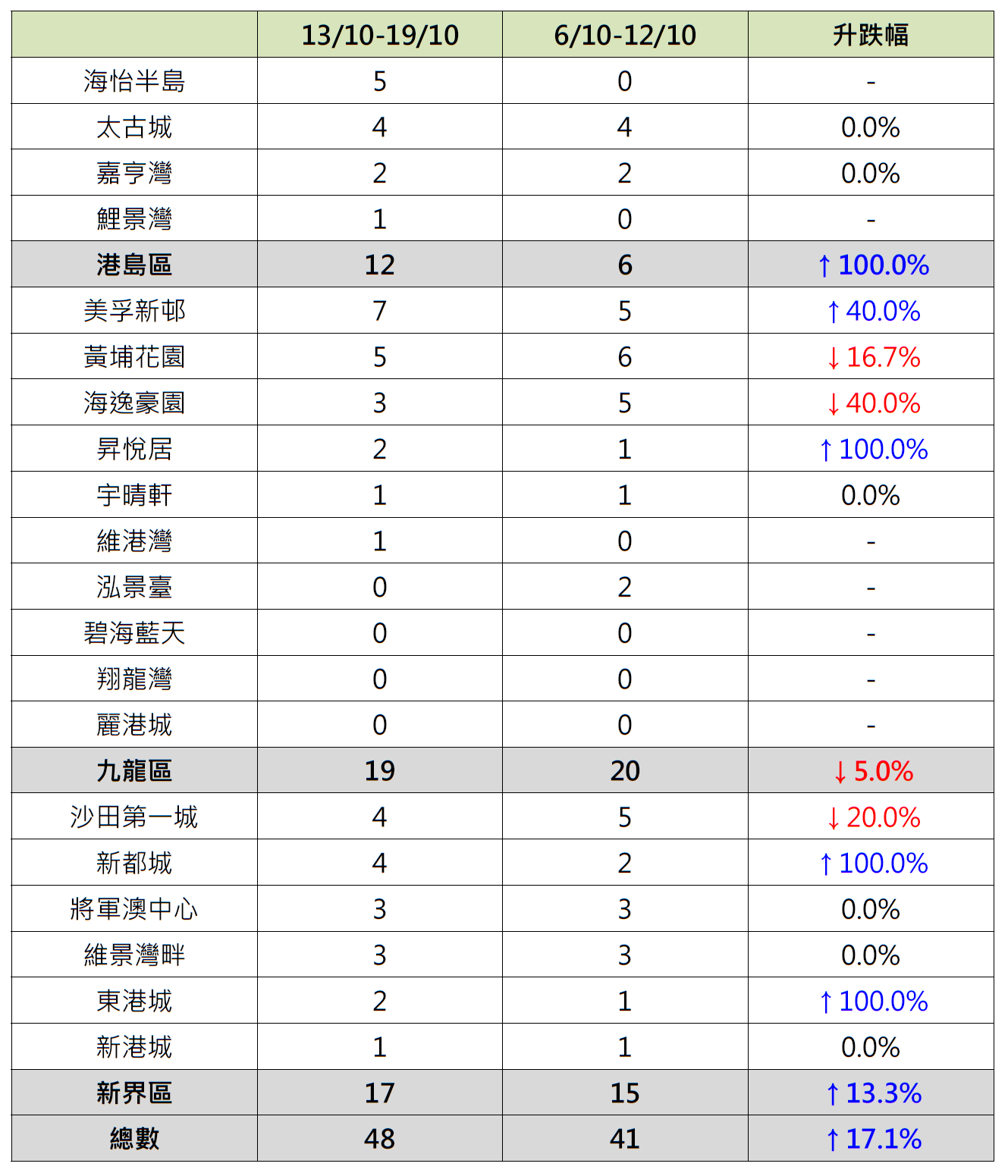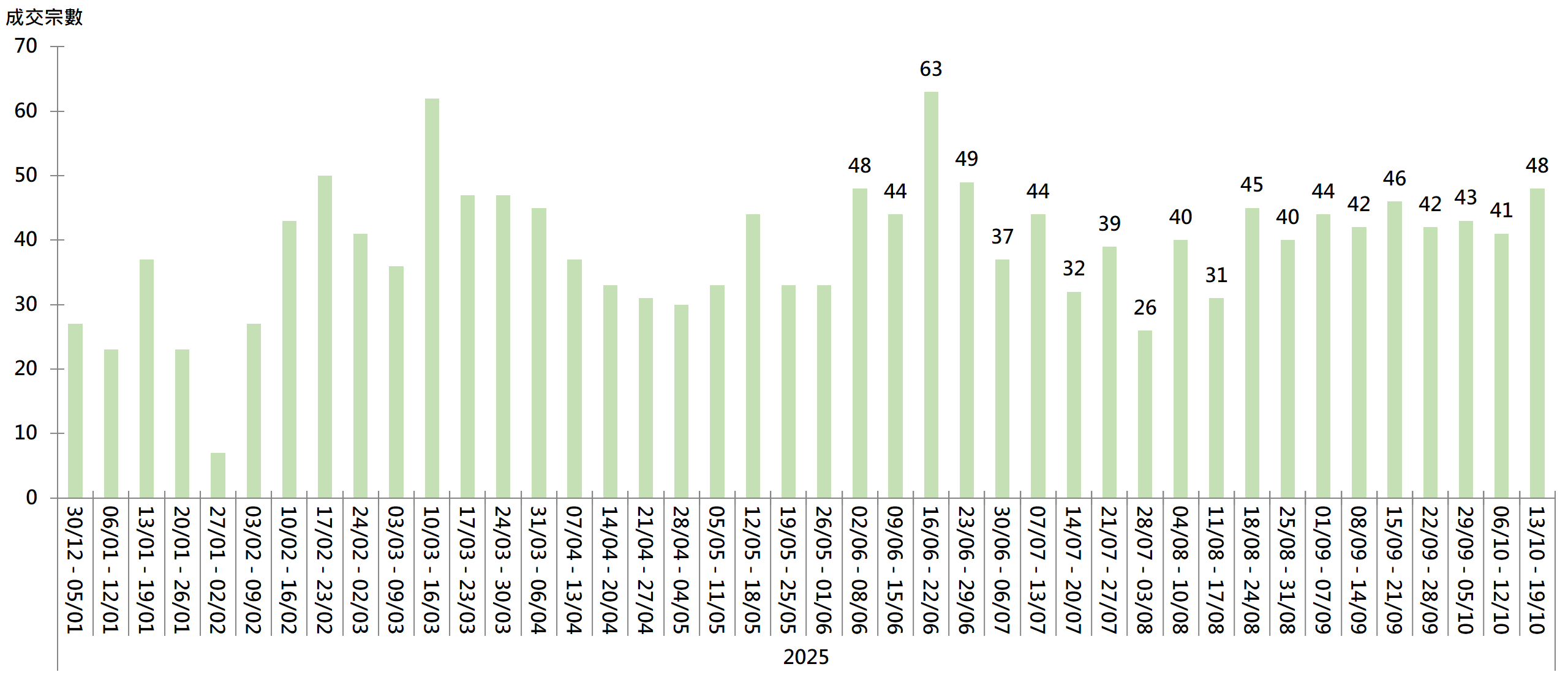 据本行前线分行所录得的数字显示,综合过去一星期(10月13日至10月19日)全港20大主要屋苑二手买卖录48宗成交,较前周(10月6日至10月12日)的41宗增加约17.1%,创16周新高,更已连续9周企稳40宗水平,反映近期二手交投畅旺(见图)。