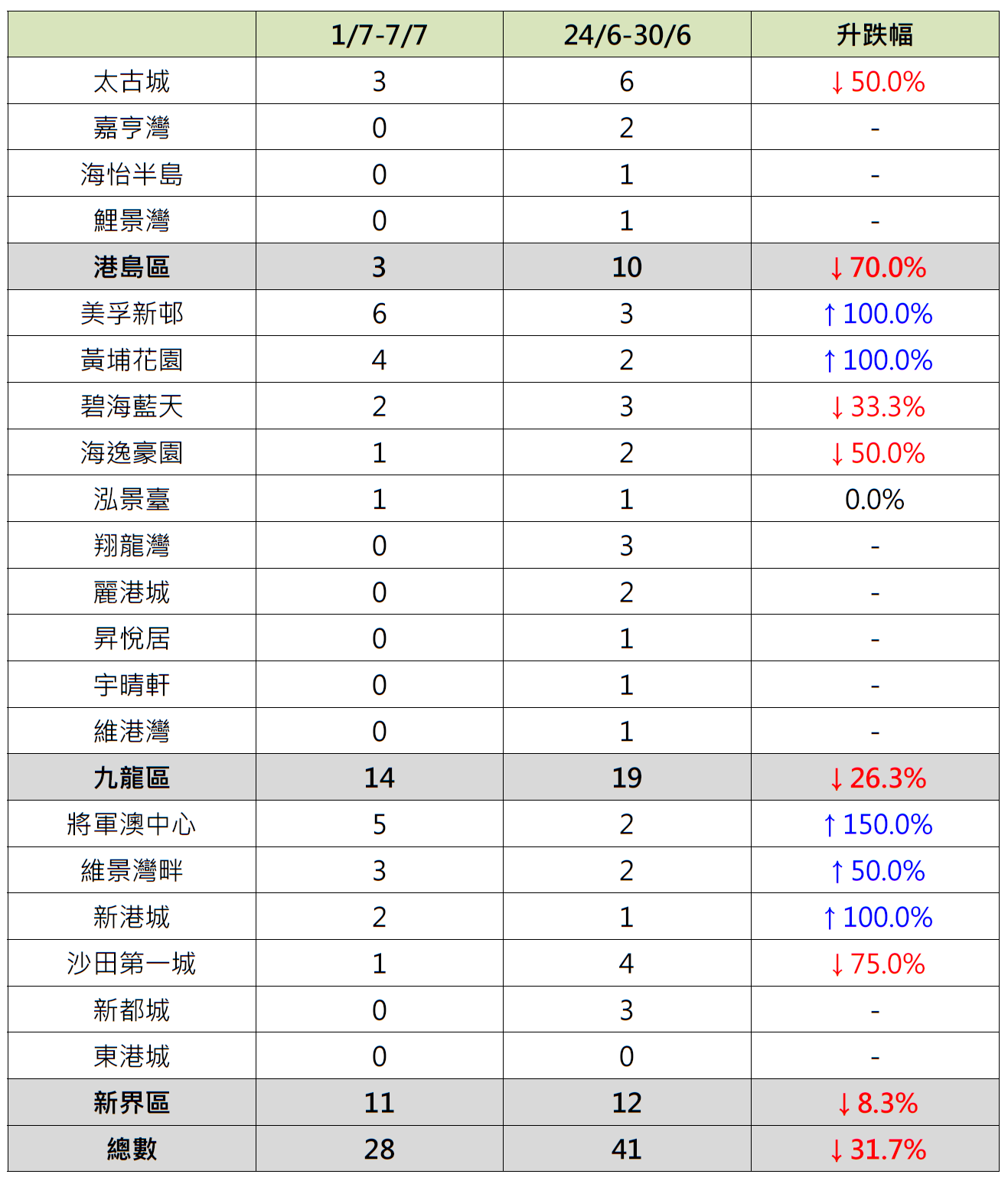 上周有瞩目新盘以低价推售,冻结市场购买力,二手交投按周回落;据本行前线分行所录得的数字显示,综合过去一星期(7月1日至7月7日)全港20大主要屋苑二手买卖录28宗成交,较前周(6月24日至6月30日)的41宗减少约31.7%,创9周新低(见图)。