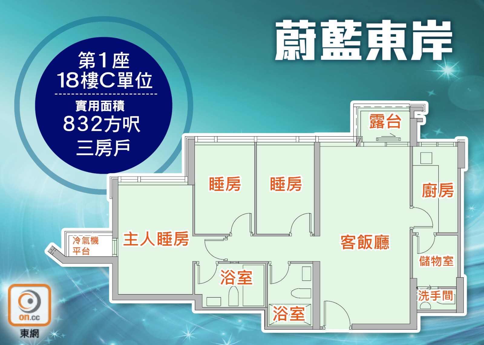 蔚藍東岸第1座18樓C單位,實用面積832方呎。