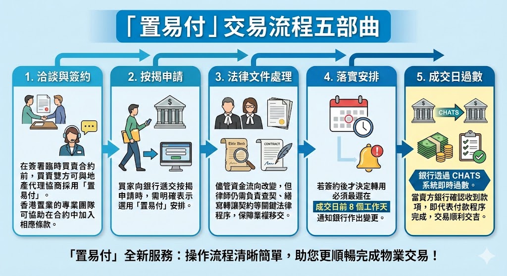 在新推行的「置易付」機制下,這筆資金將不再途經律師樓戶口。透過銀行同業間的 「港元即時支付結算系統」(CHATS),買方按揭銀行會直接將款項轉賬至賣方的按揭銀行(用以贖樓)或賣方指定的收款戶口。