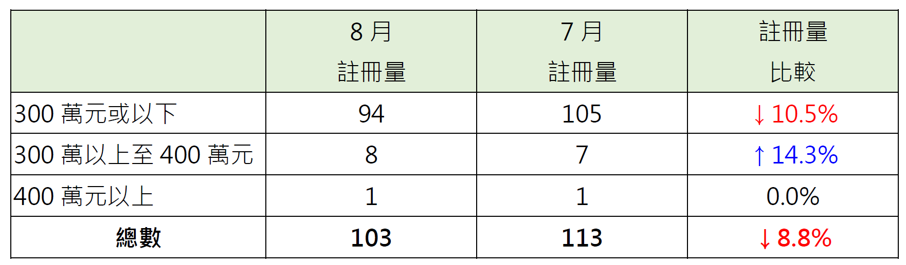 若以金額劃分8月二手公屋註冊量按月表現,當中300萬元或以下二手公屋錄94宗註冊,較7月的105宗減少約10.5%;相反,逾300萬至400萬元二手公屋錄8宗註冊,較7月的7宗增加約14.3%;而逾400萬元二手公屋錄1宗註冊,按月持平(見表)。