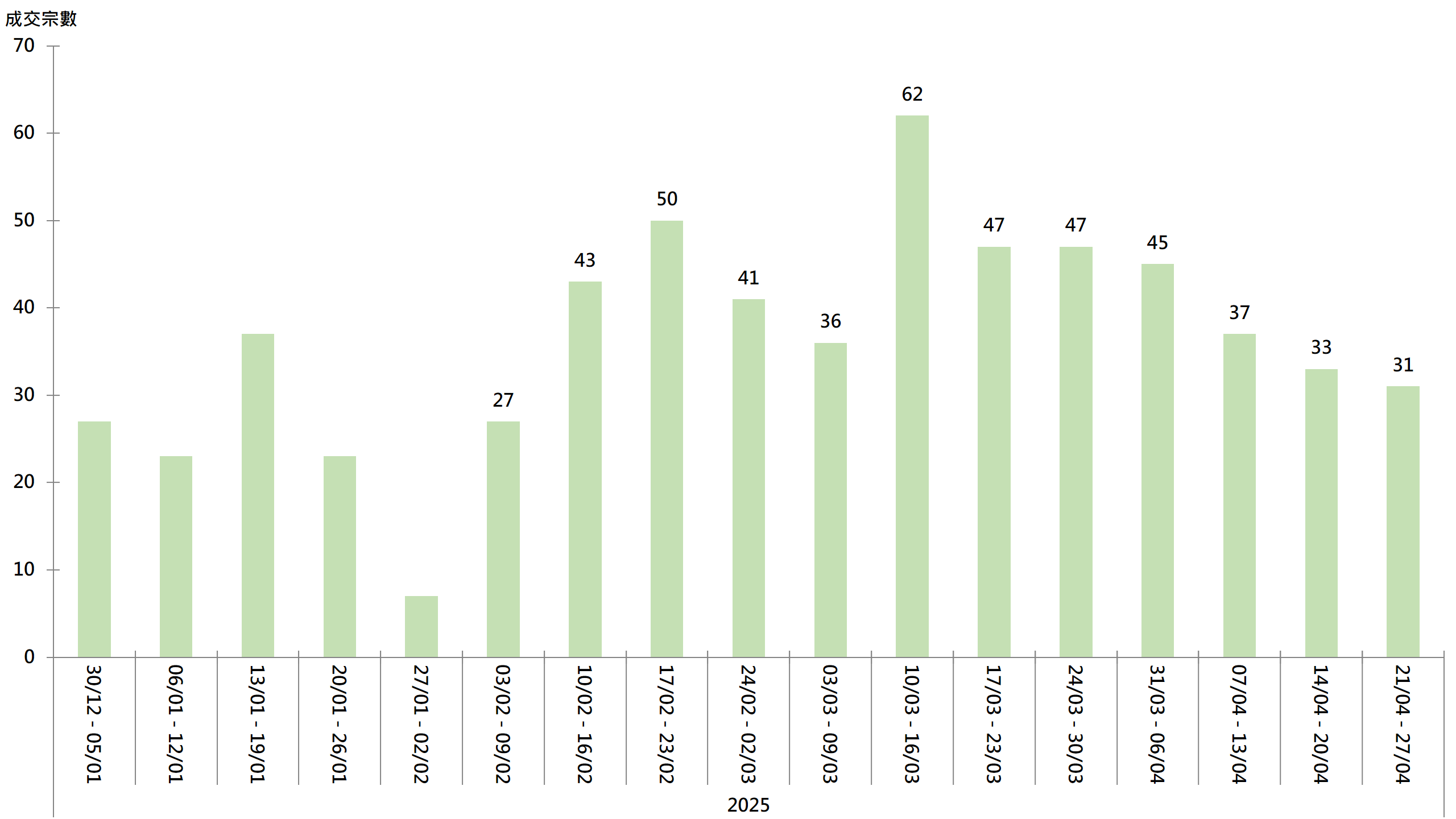 至於上周二手成交方面,過去周末有大型全新盤推售,銷情不俗,搶去市場焦點,二手交投按周下跌;據本行前線分行所錄得的數字顯示,綜合過去一星期(4月21日至4月27日)全港20大主要屋苑二手買賣錄31宗成交,較前周(4月14日至4月20日)的33宗減少2宗,連跌4周(見圖)。