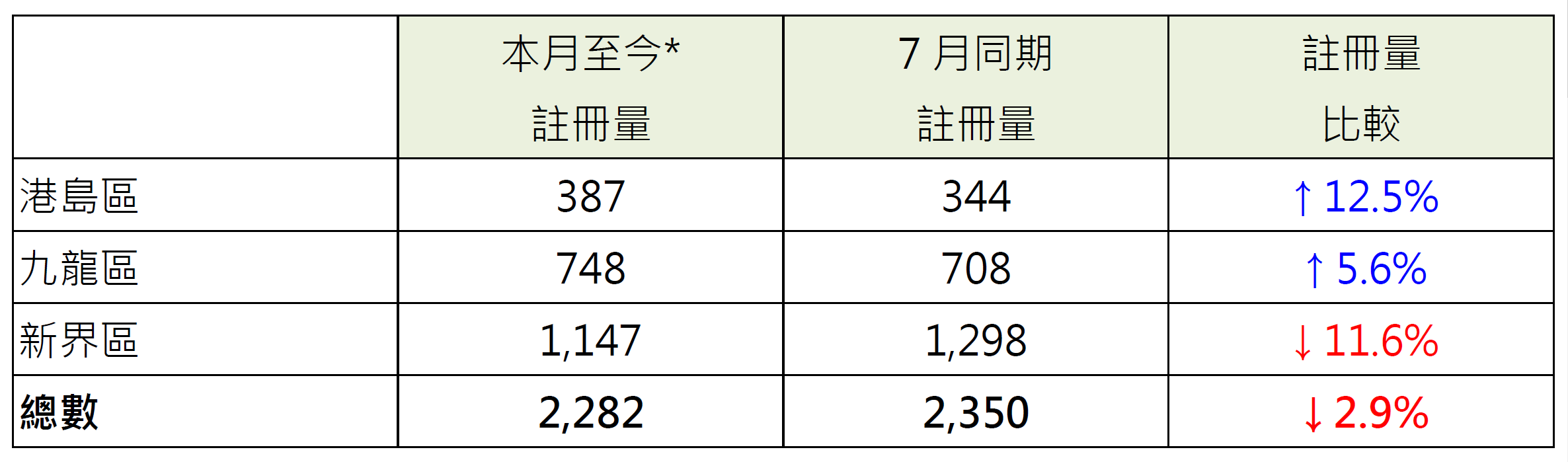 表:本月至今*各區整體住宅物業註冊量