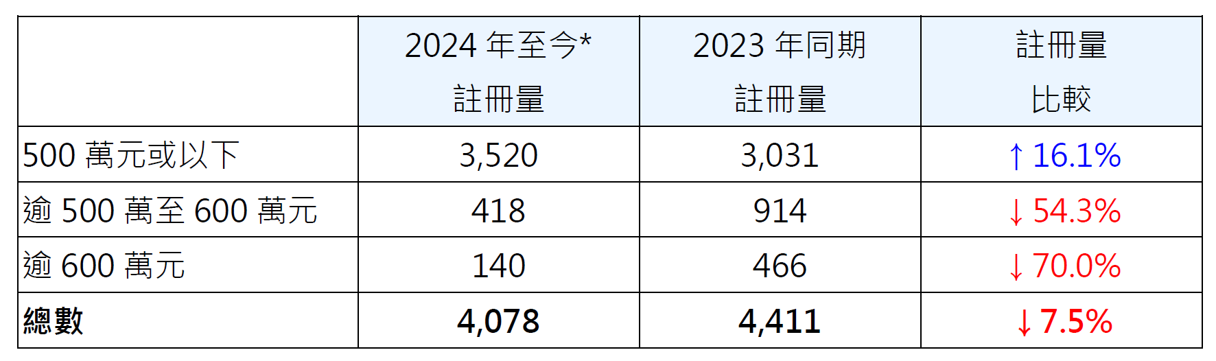 若以金額劃分本年至今二手居屋註冊量按年同期表現,當中逾600萬元二手居屋錄140宗註冊,較去年同期的466宗減少約70%;逾500萬至600萬元二手居屋錄418宗註冊,較去年同期的914宗減少約54.3%;相反,500萬元或以下二手居屋錄3,520宗註冊,較去年同期的3,031宗則增加約16.1%(見表)。