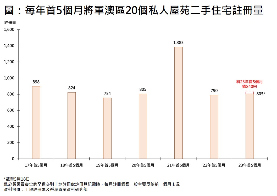 據土地註冊處資料顯示,本年至今(截至5月18日)將軍澳區20個私人屋苑錄805宗註冊,已超去年首5個月的790宗約1.9%,並已追平20年首5個月水平。估計今年首5個月宗數最終可達840宗,屆時將創6年同期第二高(見圖)。