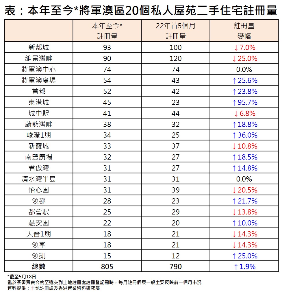 將軍澳區20個私人屋苑中,有10個屋苑本年至今二手住宅註冊量已超去年首5個月水平;有2個屋苑已追平去年首5個月水平;有8個屋苑仍較去年首5個月水平為低。