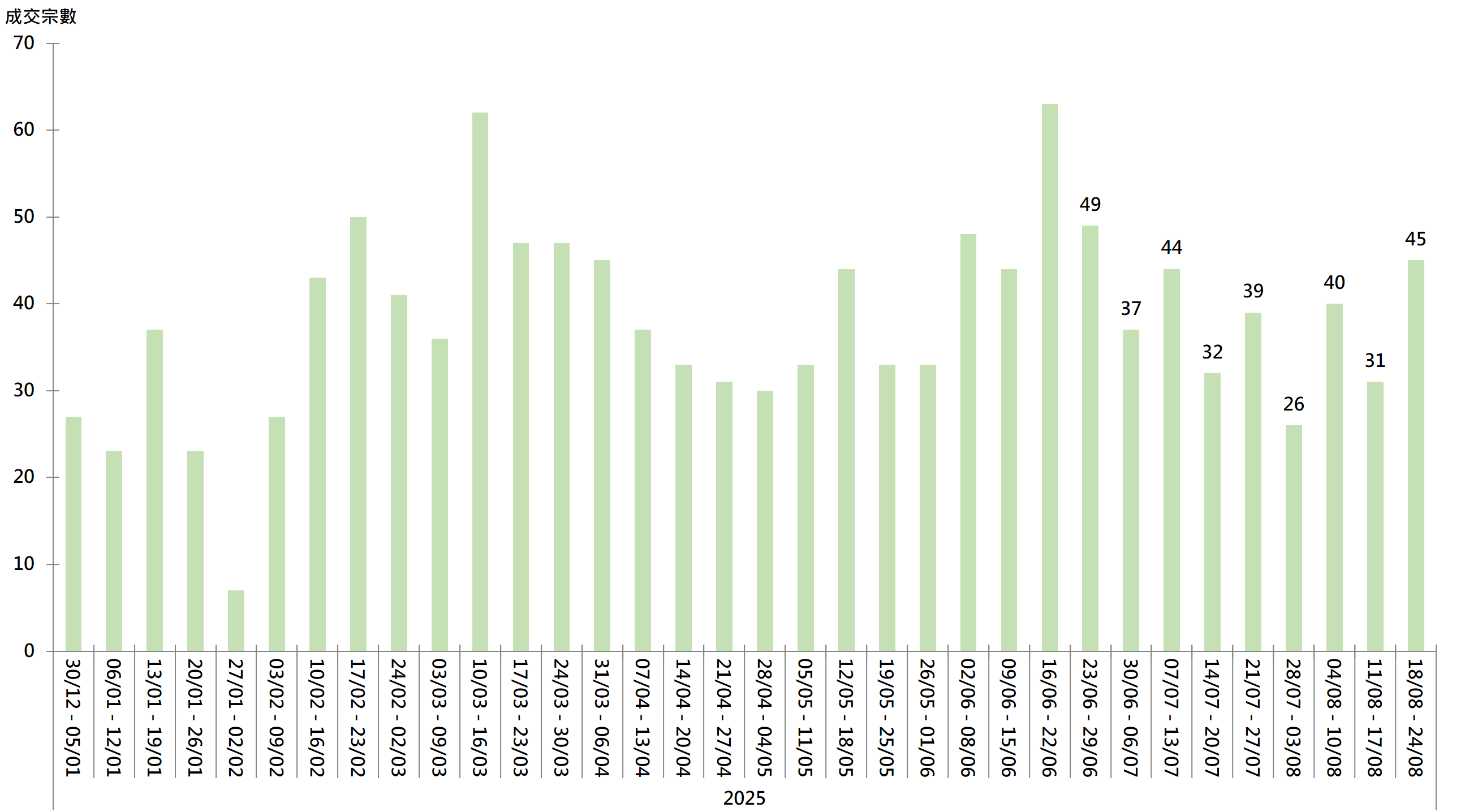 圖︰20大屋苑每周二手買賣成交宗數走勢