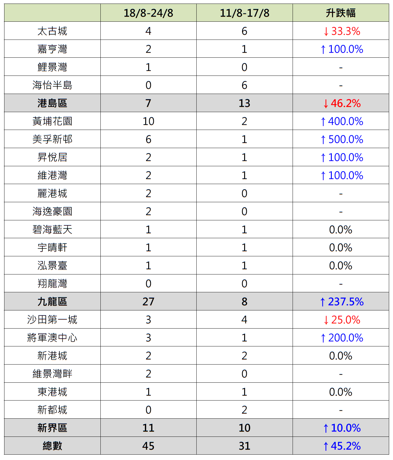 日前美國聯儲局主席鮑威爾暗示9月有望減息,為樓市帶來利好消息,20大屋苑二手交投按周錄升;據本行前線分行所錄得的數字顯示,綜合過去一星期(8月18日至8月24日)全港20大主要屋苑二手買賣錄45宗成交,較前周(8月11日至8月17日)的31宗增加約45.2%,創8周新高(見圖)。