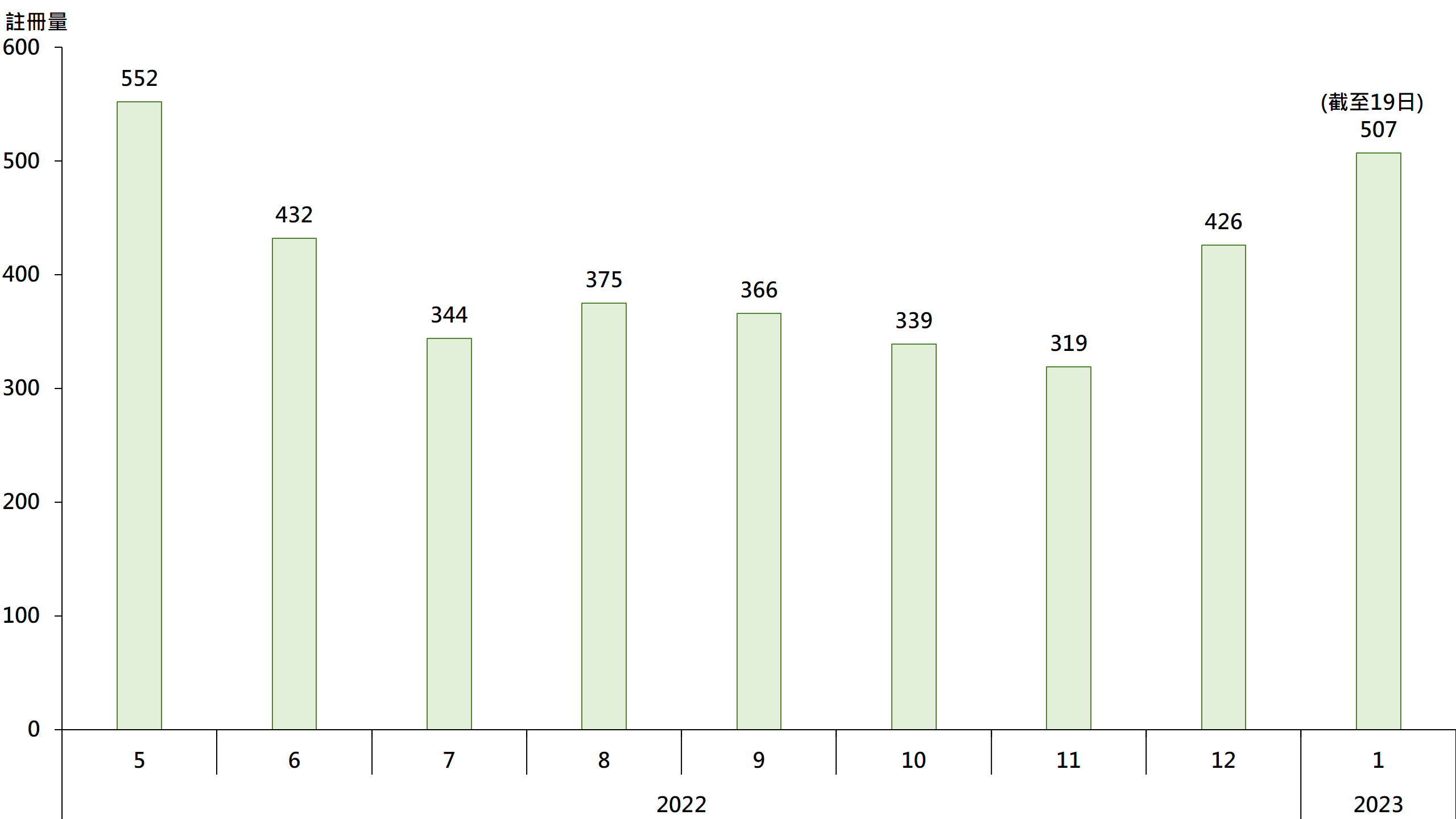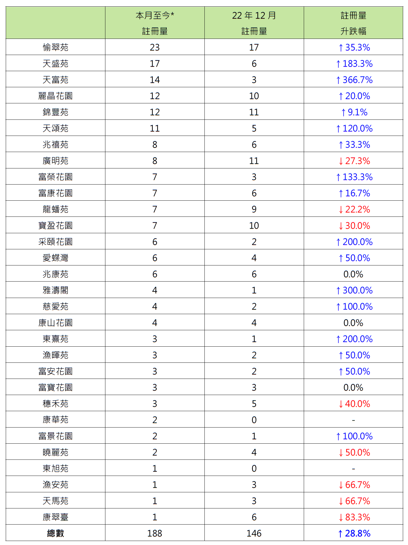 本月至今表現較好的屋苑中,天水圍天富苑錄得14宗註冊,已較12月全月的3宗高出近3.7倍;黃竹坑雅濤閣錄4宗註冊,已較12月全月的1宗高出3倍;新蒲崗采頤花園及筲箕灣東熹苑分別錄6宗及3宗註冊,同樣較12月全月高出2倍。