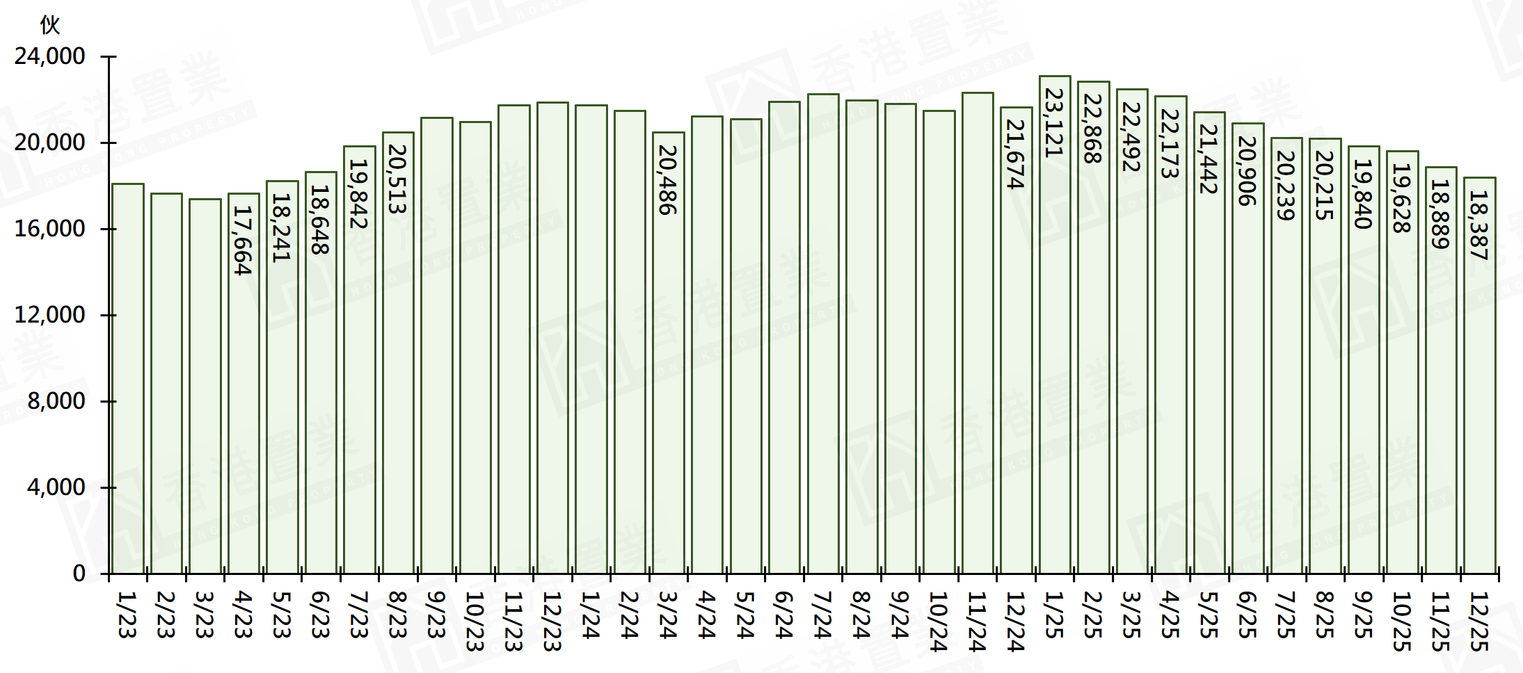 2025年股市造好、減息周期重啟、利好樓市政策出台等因素,樓市氣氛好轉,加上發展商以吸引價策略積極推售新盤,一手銷情理想,帶動累積待售貨尾量下跌;據香港置業資料研究部資料顯示,2025年全港累積待售貨尾量(包括樓花及現樓)錄約18,387伙,較2025年11月約18,889伙減少約2.7%,連跌11個月,創逾2年半新低;若與2024年12月約21,674伙相比,2025年年內累積貨尾共減少近3,300伙(見圖一)。