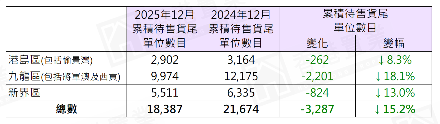 若以三區劃分2025年累積待售貨尾數量變化,港島、九龍及新界3區均按年全線減少,當中減幅最多的是九龍區(包括將軍澳及西貢),2025年12月待售貨尾單位有約9,974伙,較2024年12月約12,175伙大幅減少約2,201伙,減幅達18.1%;其次為新界區,2025年12月待售貨尾單位有約5,511伙,較2024年12月約6,335伙減少約824伙,減幅約13%;而港島區(包括愉景灣)2025年12月待售貨尾單位有約2,902伙,較2024年12月約3,164伙減少約262伙,減幅約8.3%(見表)。