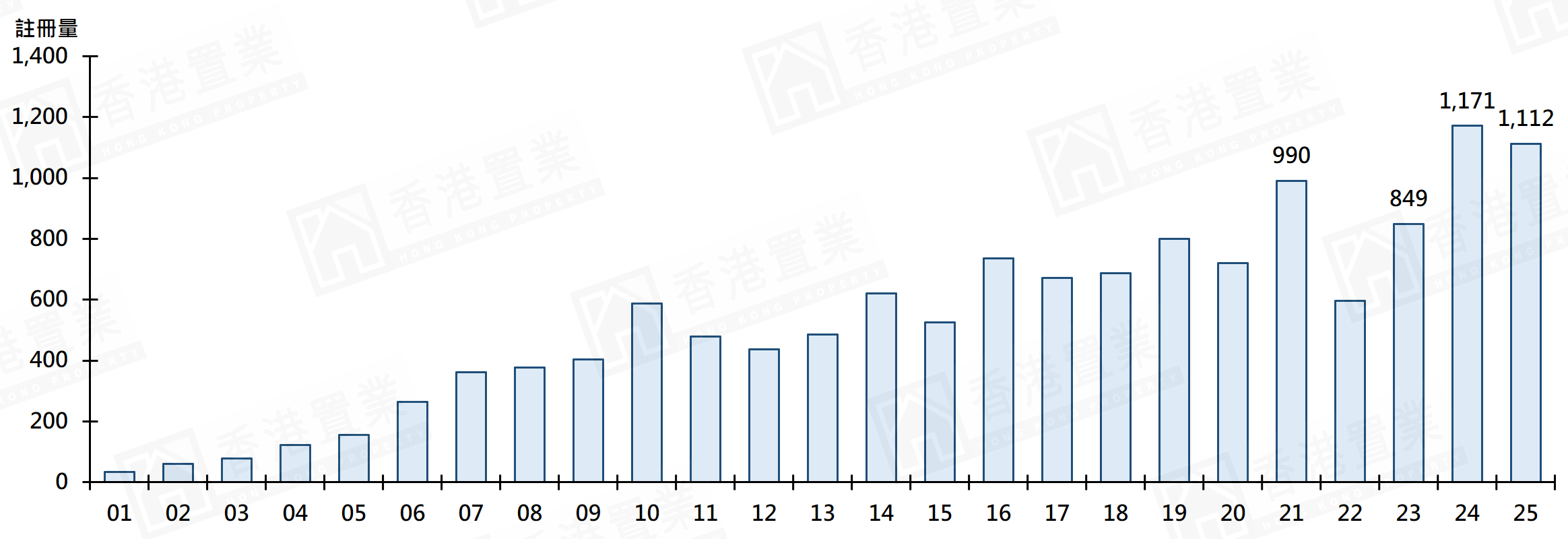 若以三區劃分2025年住宅車位註冊量按年表現,當中港島區錄1,146宗住宅車位註冊,較2024年的836宗增加約37.1%,三區中按年增幅最顯著;九龍區錄1,287宗住宅車位註冊,較2024年的974宗增加約32.1%;新界區錄2,661宗住宅車位註冊,三區中最多,較2024年的2,222宗增加約19.8%。