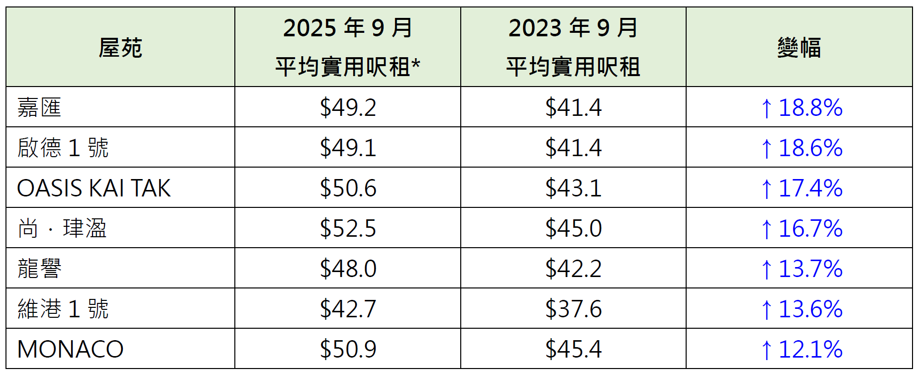 表:2025年9月份啟德部份屋苑平均實用呎租