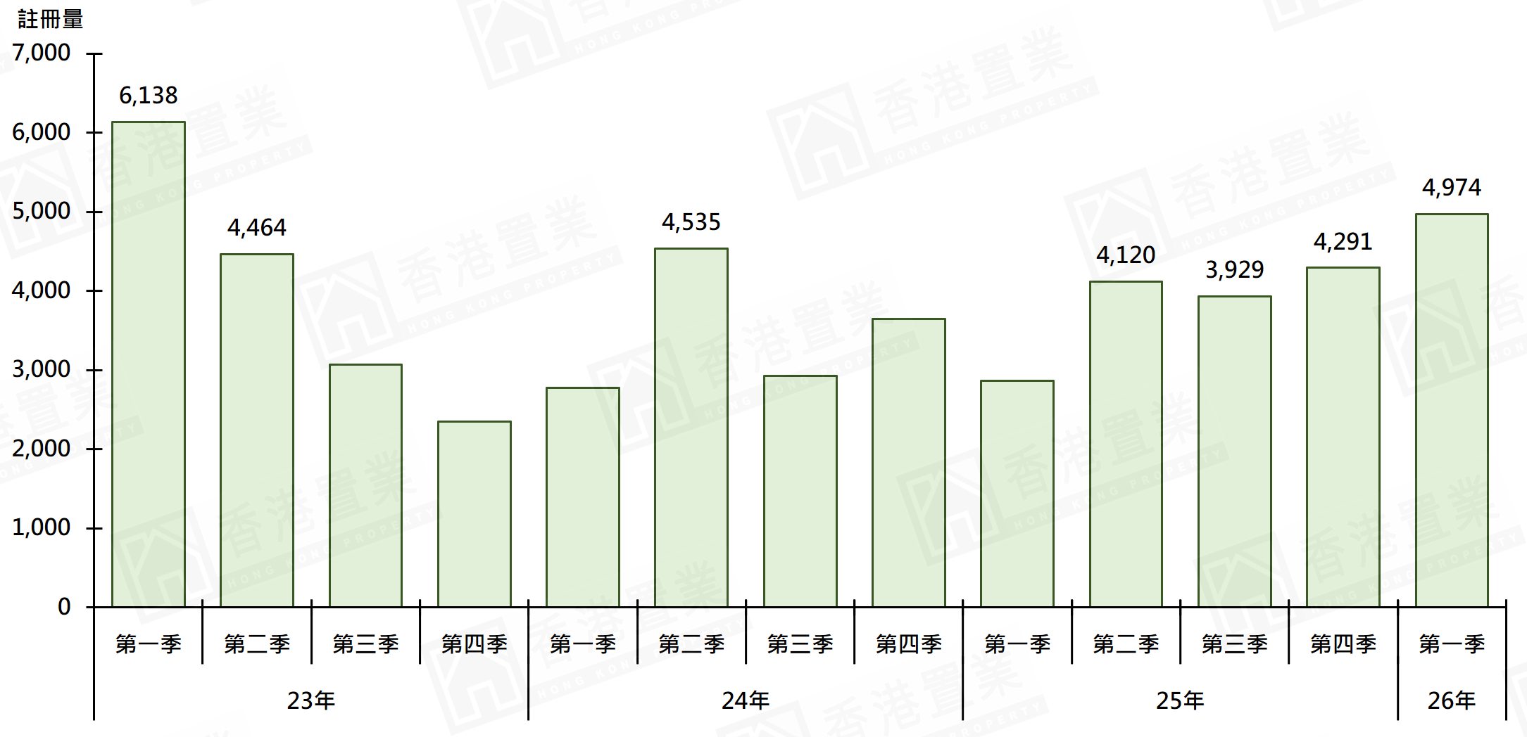 據香港置業資料研究部綜合土地註冊處資料顯示,首季逾500萬至1,000萬元二手住宅錄4,974宗註冊,較去年第四季的4,291宗增加約15.9%,創12個季度(即3年)新高(圖)。