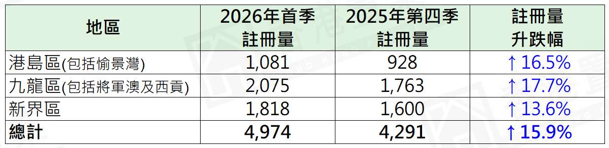 若以港島、九龍及新界三區劃分首季逾500萬至1,000萬元二手住宅註冊量按季表現,當中新界區錄1,818宗逾500萬至1,000萬元二手住宅註冊,較去年第四季的1,600宗增加約13.6%;港島區(包括愉景灣)錄1,081宗註冊,較去年第四季的928宗增加約16.5%;九龍區(包括將軍澳及西貢)錄2,075宗註冊,三區中最多,較去年第四季的1,763宗增加約17.7%,增幅三區中最為突出(表)。