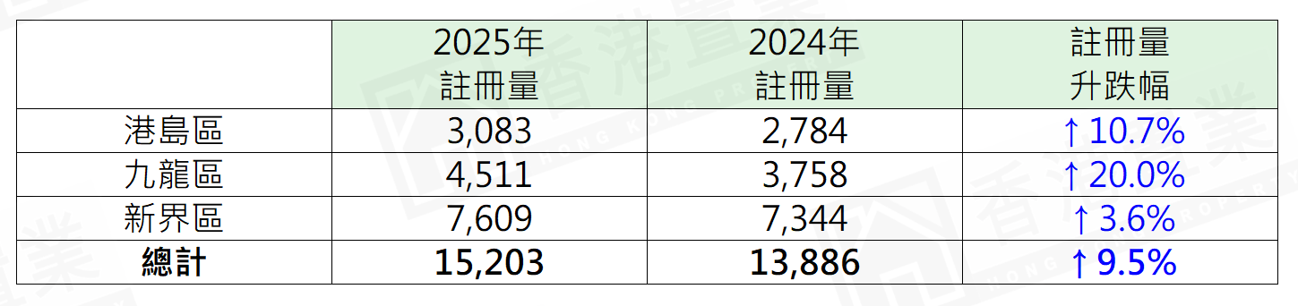 據土地註冊處資料顯示,2025年逾500萬至1,000萬元二手住宅(包括二手私人住宅及二手公營房屋)錄15,203宗註冊,較2024年的13,886宗增加約9.5%(見圖)。