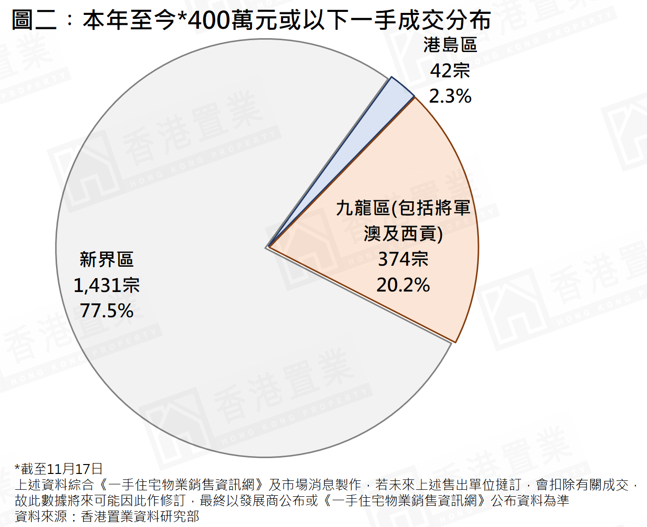 至於本年至今(截至11月17日)400萬元或以下一手成交中,新界區錄1,431宗,三區中最多,佔總數約77.5%,遠超九龍區(包括將軍澳及西貢)的374宗,佔總數約20.2%,而港島區僅錄42宗,佔總數約2.3%(見圖二)。
