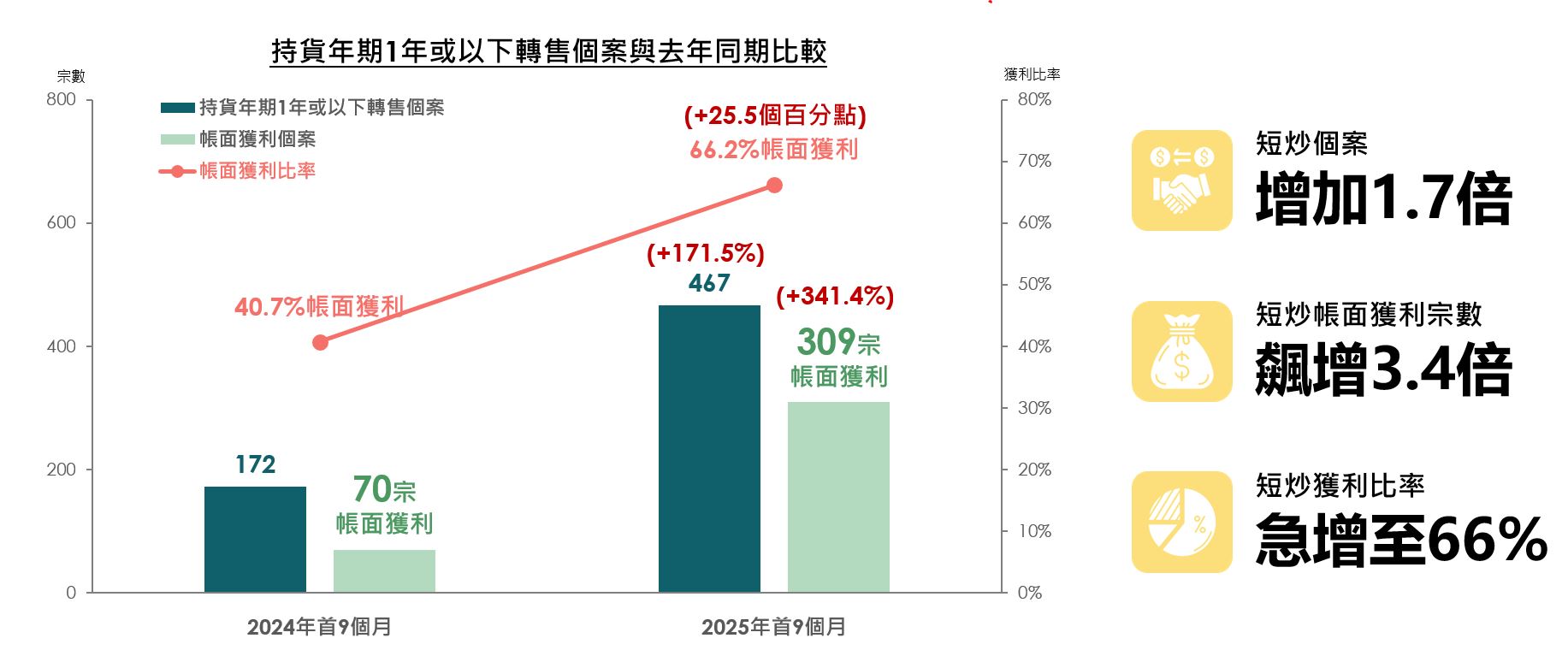 如果將持貨期1年為以下的轉售個案定義為短炒個案,比較2025年首三季和去年同期的數據,今年錄得467宗個案,為去年172宗的2.72倍!