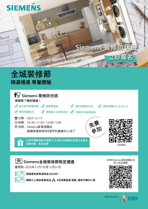 繼11月的「廚房升級實戰班」後,德國銷量No.1 家電品牌與裝修佬再度攜手,於12月舉辦「Siemens裝修防伏班」,旨在為您提供一套全面、實用且易於執行的避險指南,讓您能在裝修前做足功課。