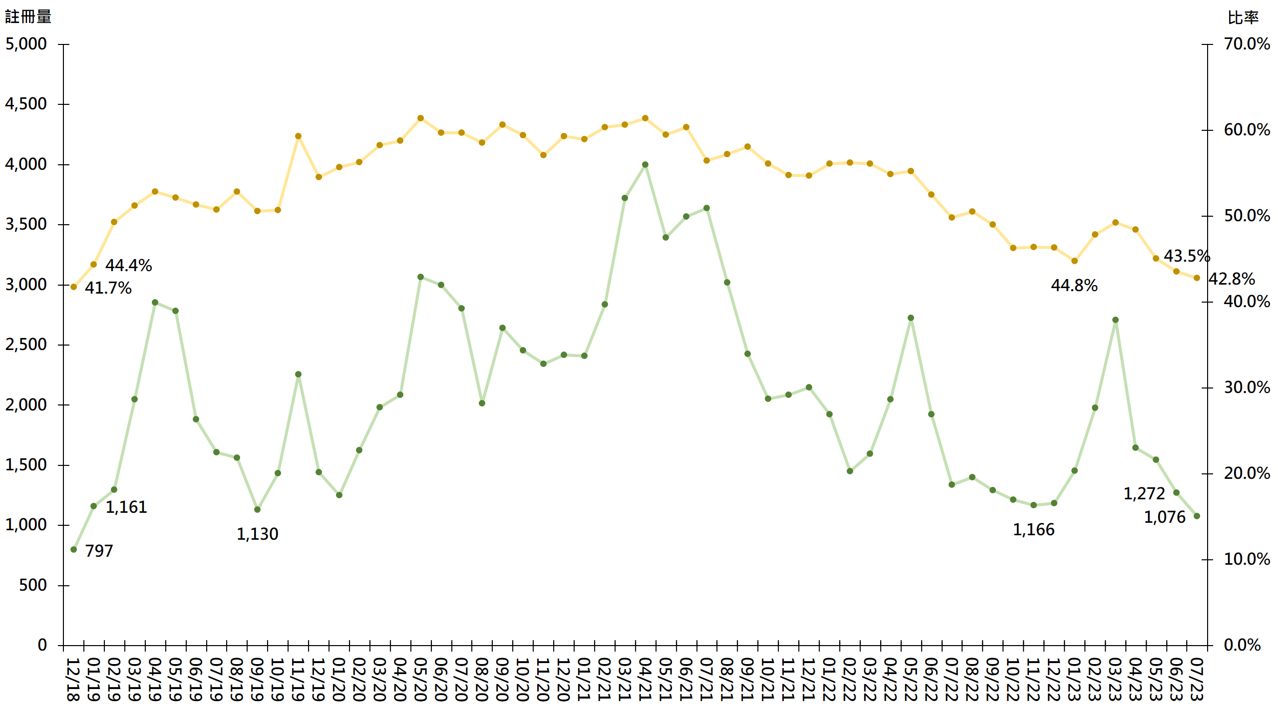 若與整體二手住宅7月錄2,515宗註冊,較6月的2,921宗減少約13.9%相比,7月逾500萬至1,000萬元二手住宅註冊量按月表現跑輸大市,其佔整體二手住宅註冊量比率由6月約43.5%,減少至7月約42.8%,亦創逾4年半新低(見圖)。