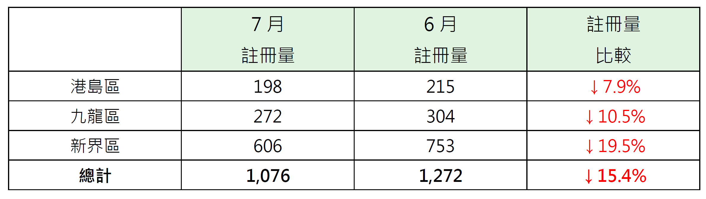 以港島、九龍及新界三區劃分7月逾500萬至1,000萬元二手住宅註冊量表現,其中新界區錄606宗註冊,較6月的753宗減少約19.5%;九龍區錄272宗註冊,較6月的304宗減少約10.5%;港島區錄198宗註冊,較6月的215宗減少約7.9%(見表)。